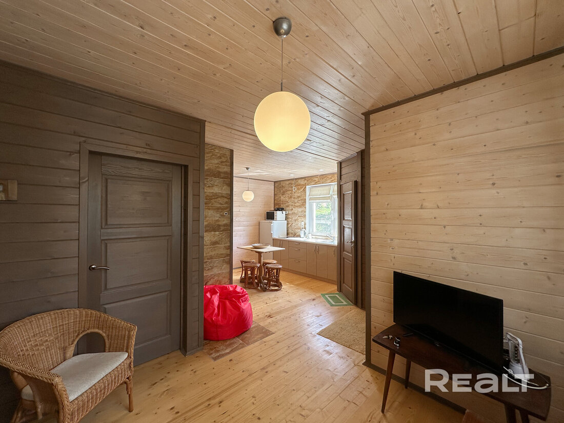 На первом этаже дома расположилась уютная кухня, гостиная и одна жилая комната, которая подойдет для спальни, кабинета или игровой.