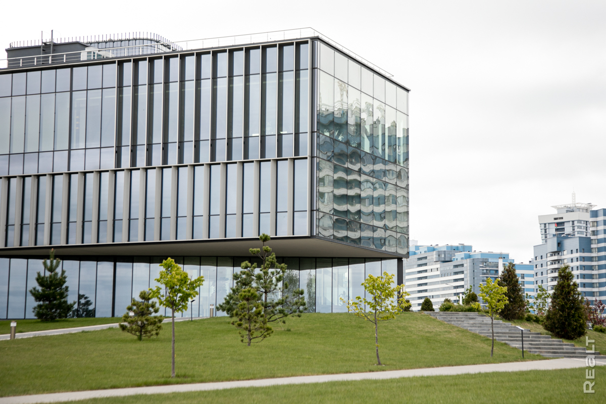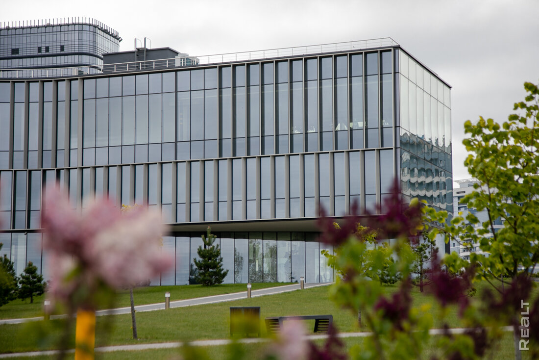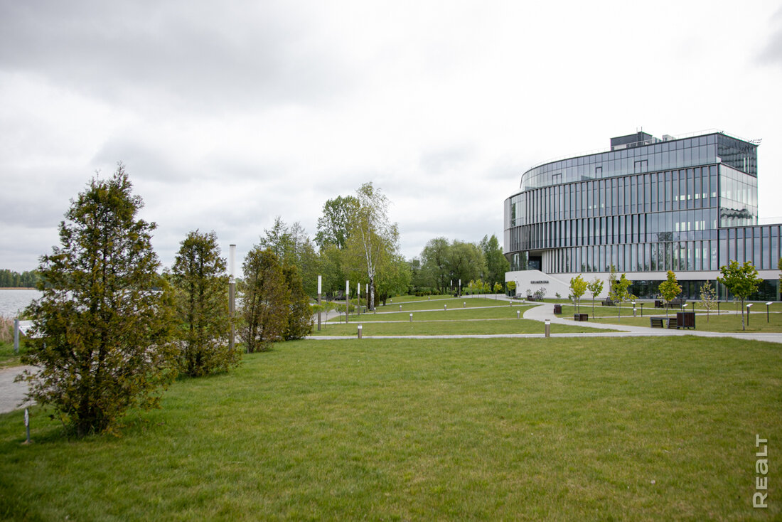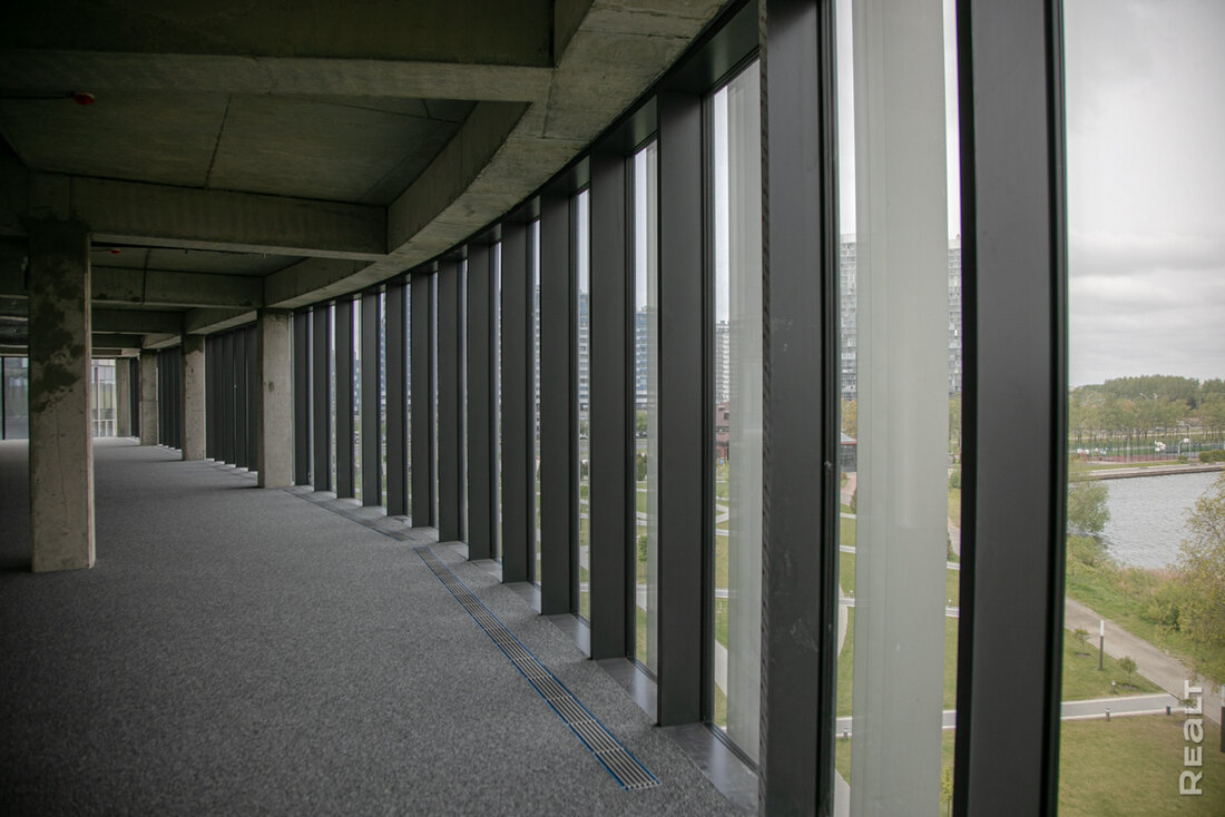 Офисное помещение находится на верхнем уровне и буквально окружено панорамными окнами: с одной стороны — Дрозды и лес, с другой — ухоженный внутренний двор с ландшафтным дизайном.