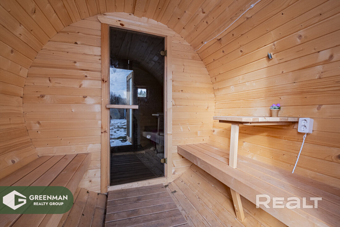 Имеется баня-бочка, вольер для собак и хозпостройка, есть раскладной бассейн.