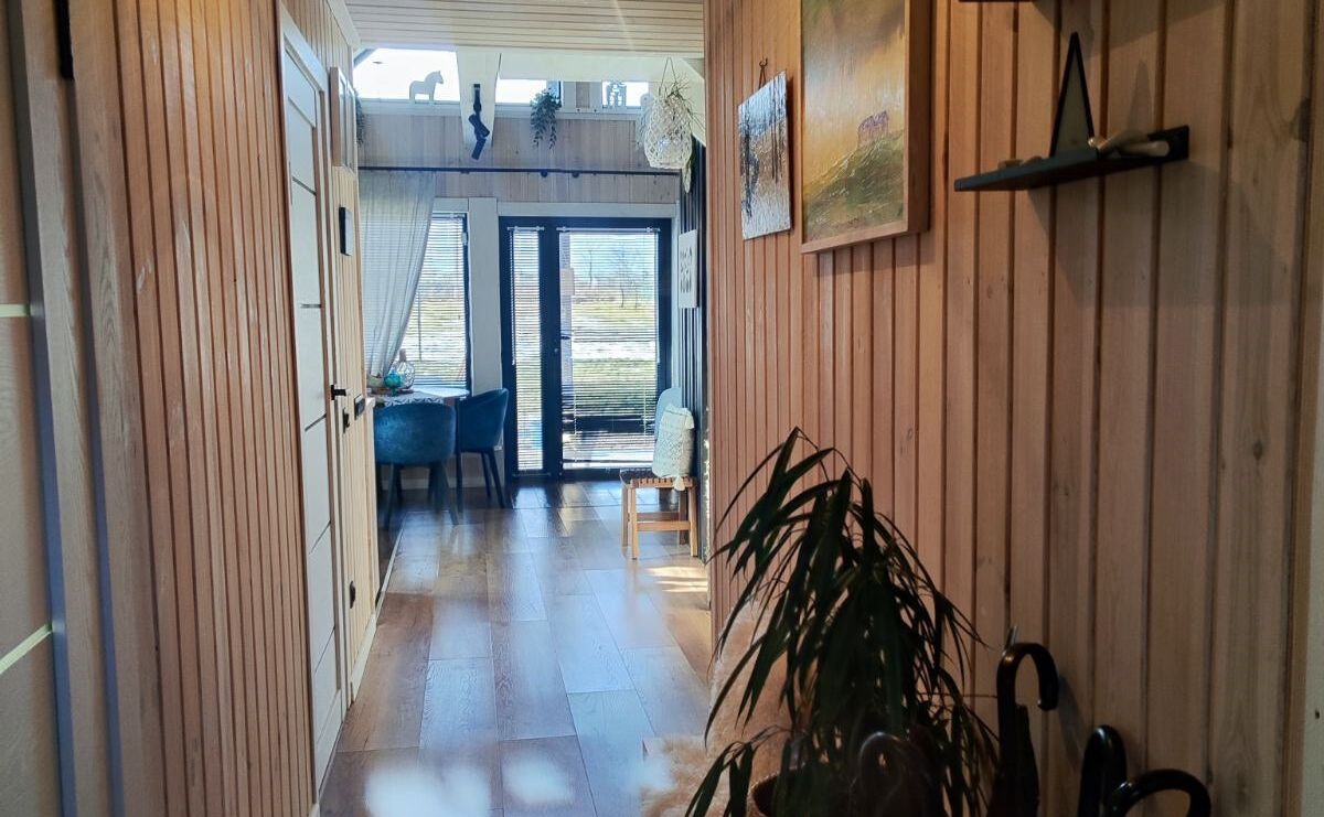 Дом здесь каркасный, 2018 года постройки. Он компактный — всего 60,2 м2. Планировка простая: гостиная-кухня, две спальни, санузел, прихожая. Второй этаж подразумевается, но еще не достроен.