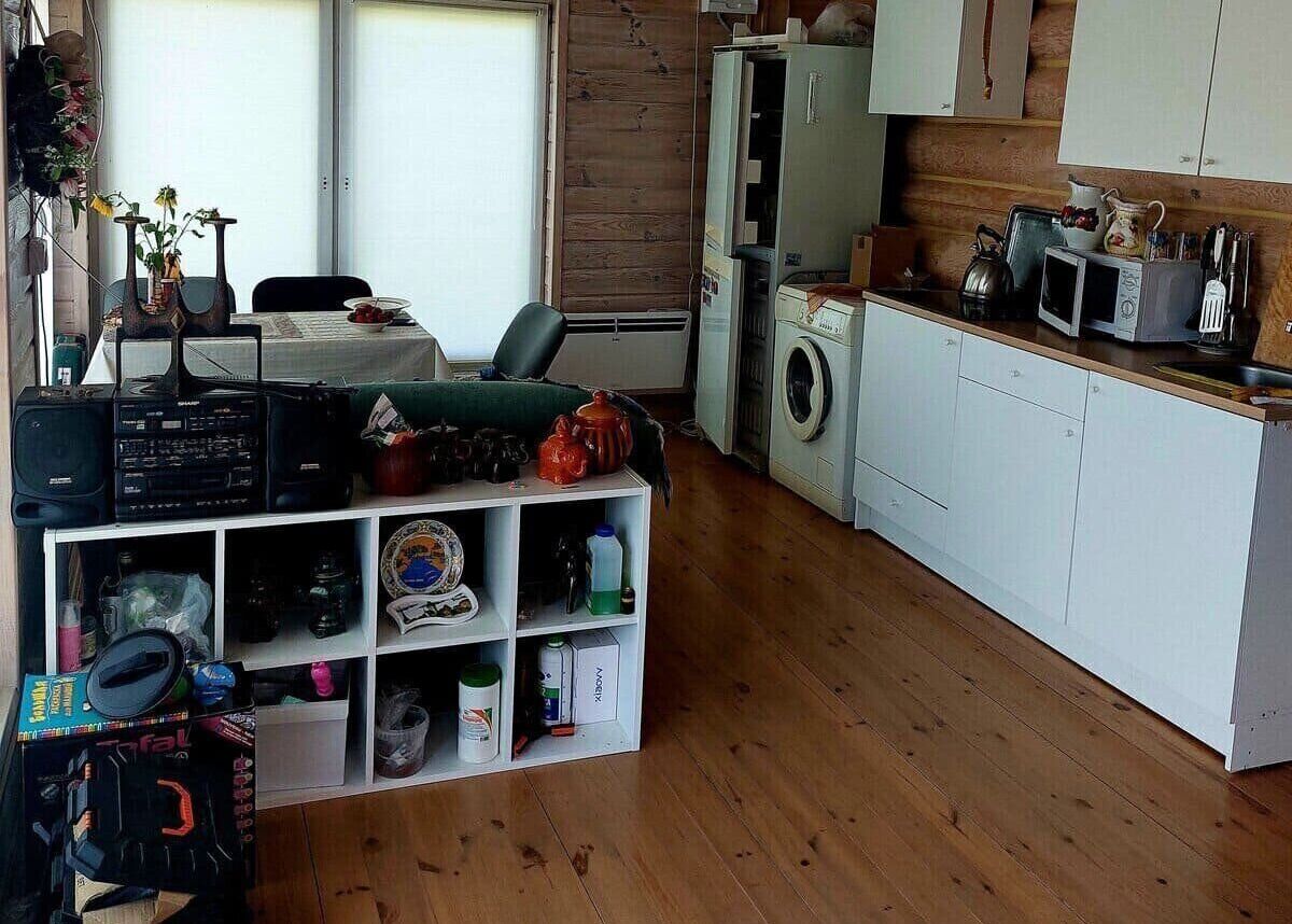 Дом деревянный, в два этажа, общая площадь – 77,7 м2. На первом этаже размещены кухня, гостиная, прихожая и санузел. Спальни находятся на втором этаже.