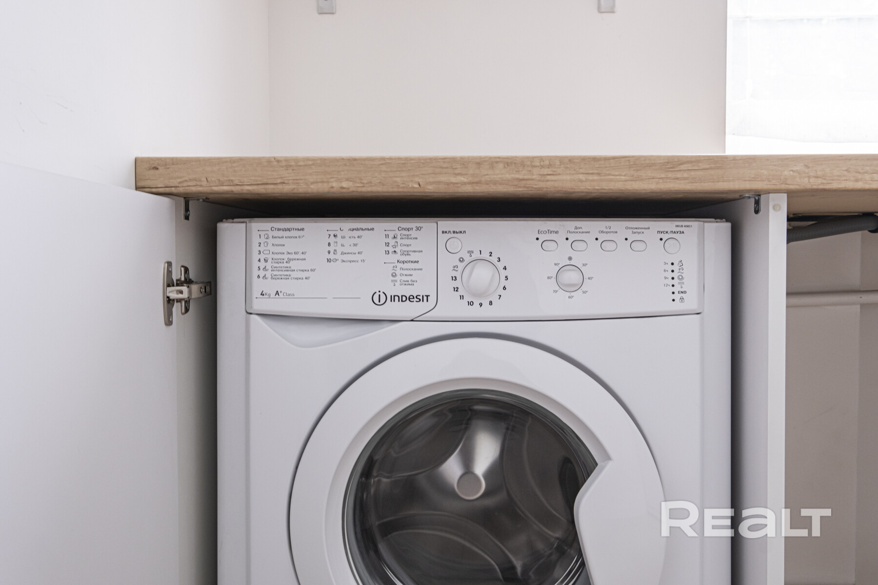 Здесь сделан ремонт в светлых тонах: стены выкрашены в белый цвет, напольное покрытие — ламинат. Имеется и бытовая техника: телевизор, стиральная машина, холодильник, СВЧ, плита и духовой шкаф.