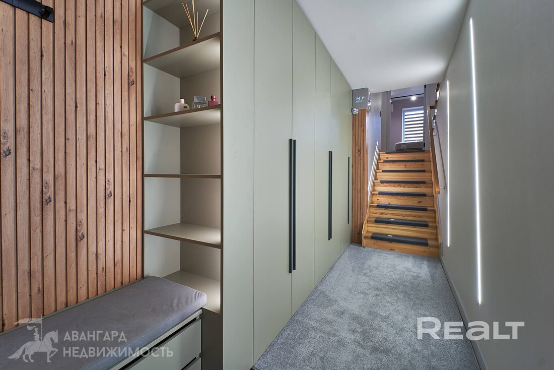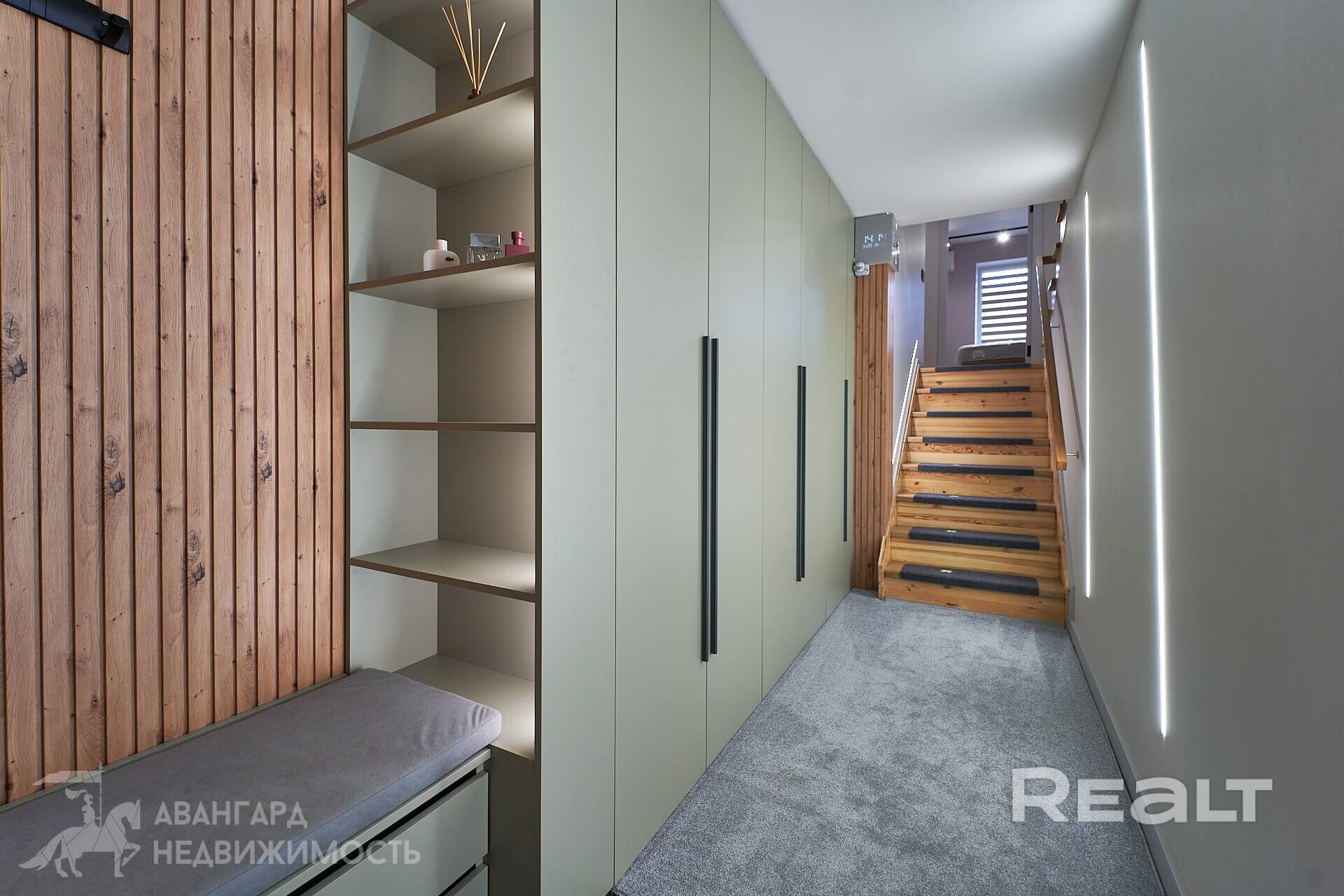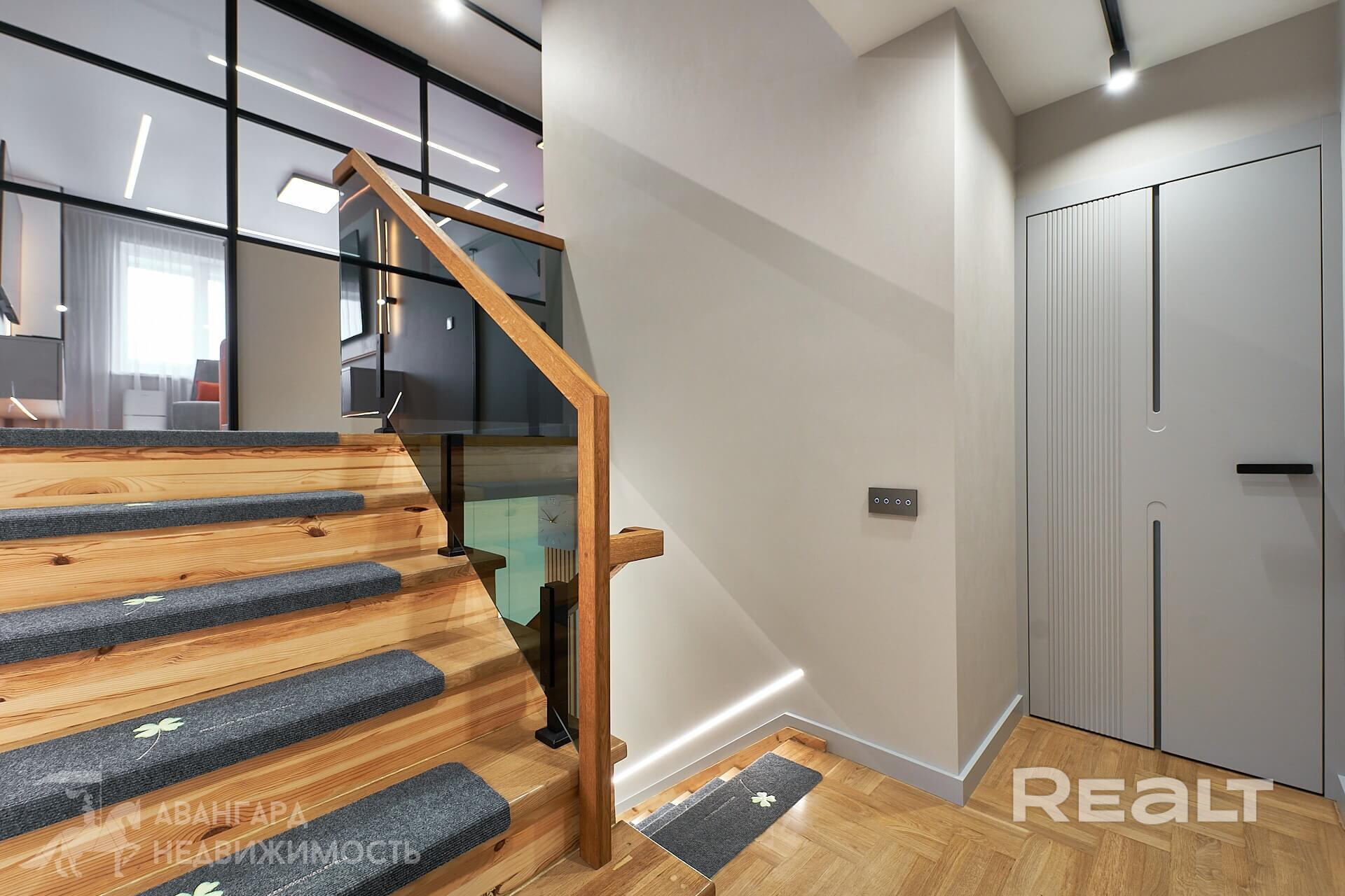 В евротрешке сделан современный ремонт и небольшая перепланировка. Помогает за всем уследить система «умный дом»: есть доступ к управлению системы безопасности, освещения, климата, техники и мультимедиа. Первый уровень представляет собой вытянутую прихожую. На второй этаже ведет лестница из дуба, ограждение выполнено из тонированного закаленного стекла в 10 мм.