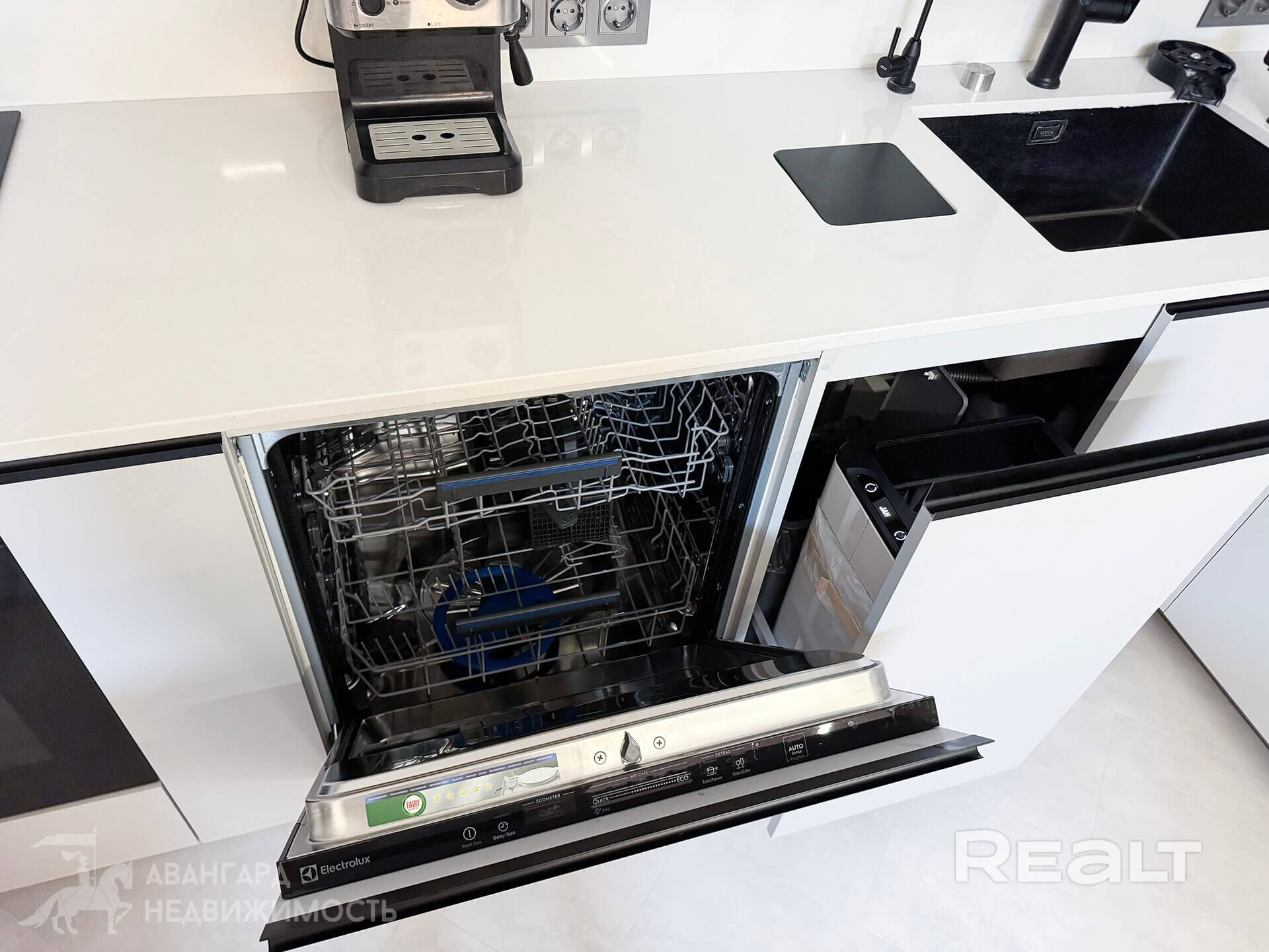 Дальше — совмещенная кухня-гостиная. Вся мебель и кухня выполнены с использованием фурнитуры Blum. После продажи остаются посудомоечная машина, духовой шкаф, интегрированная мойка с фильтрами, мойкой для стаканов и сенсорным дозатором и все остальное, что есть на фото.