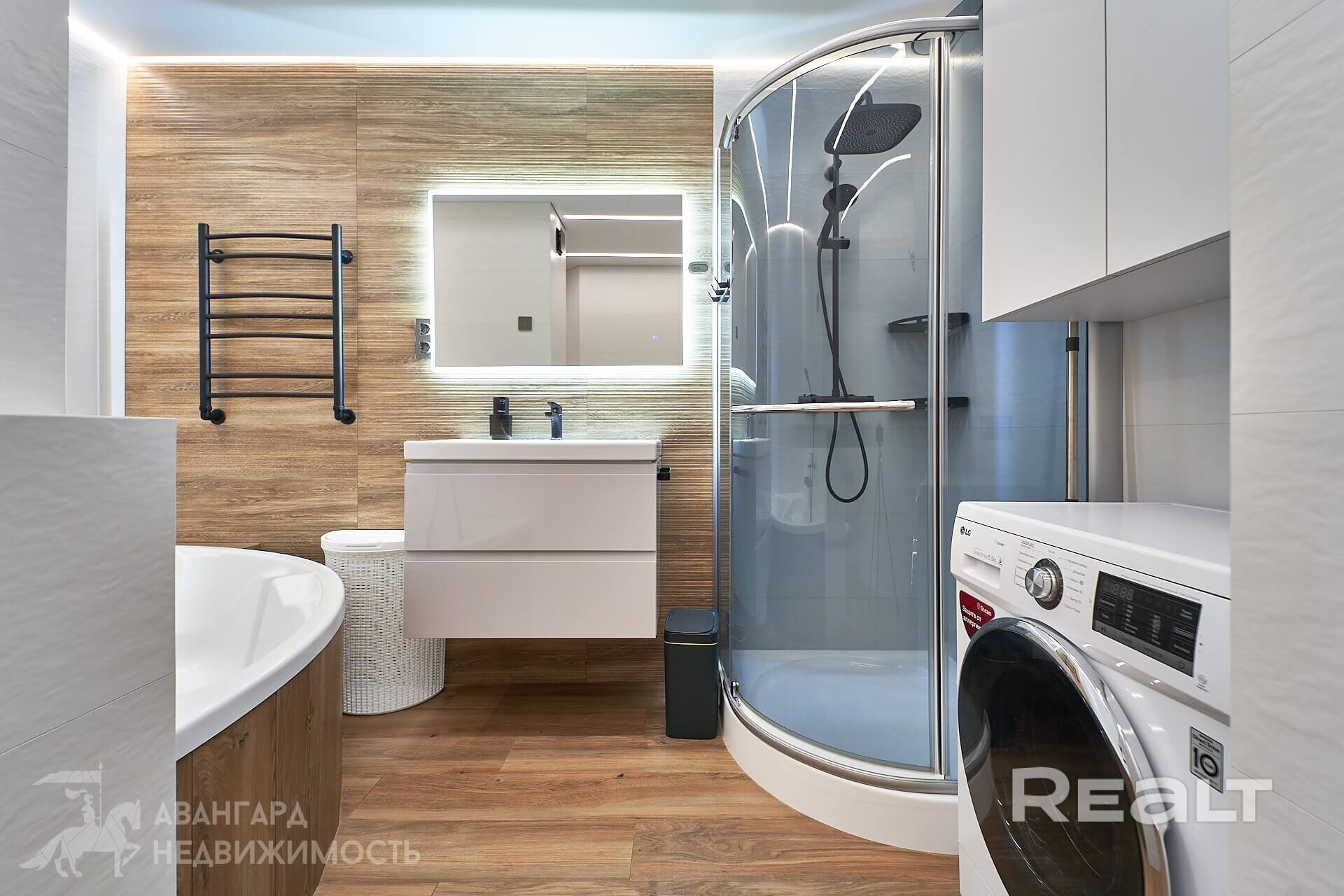 Санузел также совмещенный. Идет с душевой кабиной, ванной. Поместилась и стиральная машина.