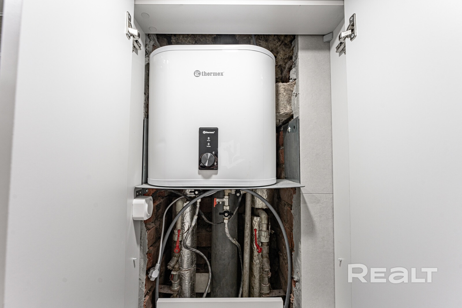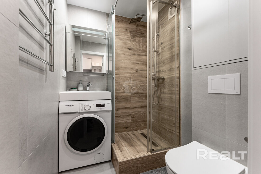 В совмещенном санузле стоит душевая кабина, стиральная машина, установлен бойлер.