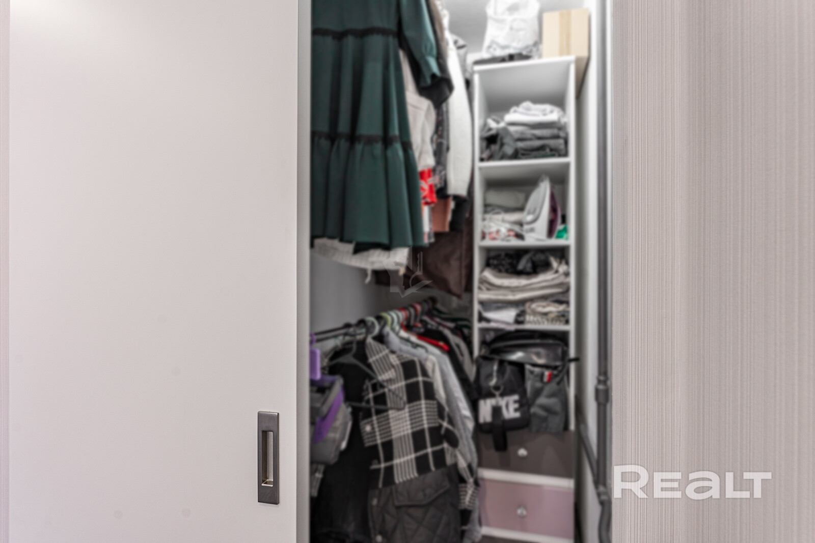 Спальня разместилась за перегородкой. Тут же есть выход в гардеробную, которую сделали из кладовой.