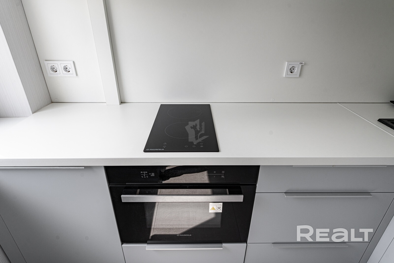 В однушке обставлена техникой и мебелью кухонная зона: есть варочная панель, духовой шкаф бренда Maunfeld, вытяжка и холодильник.