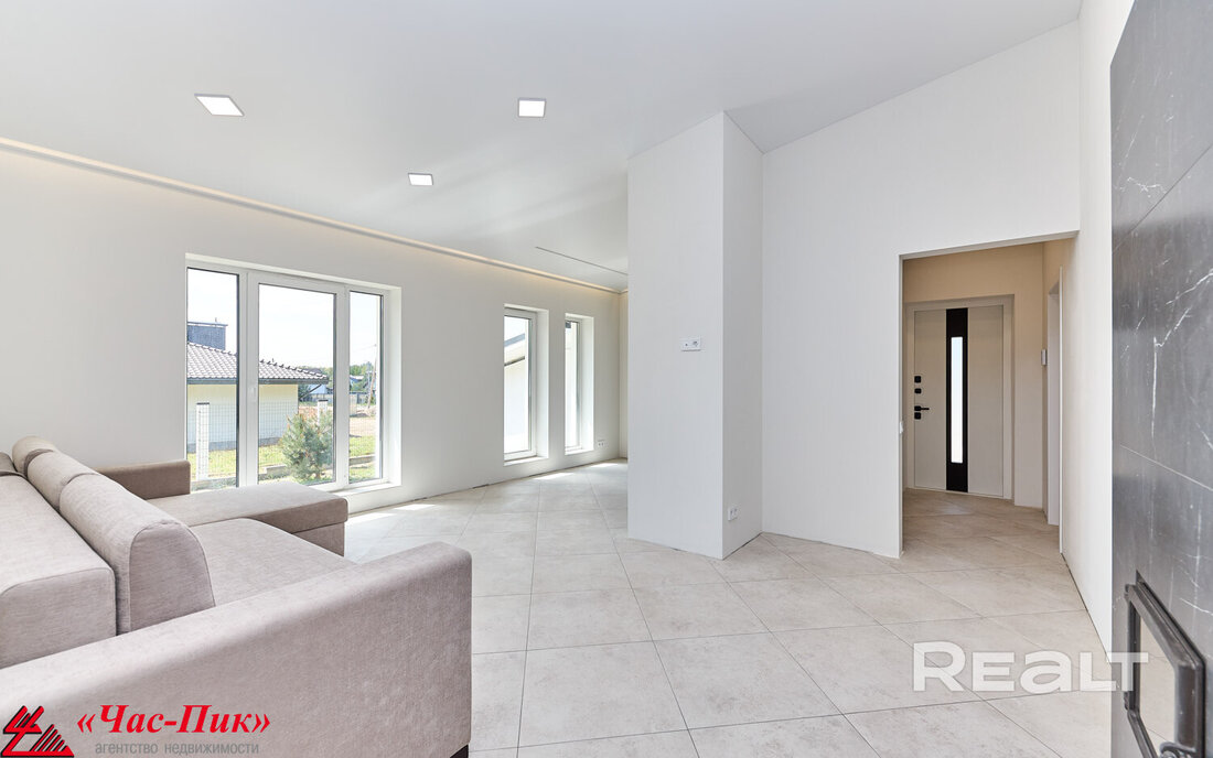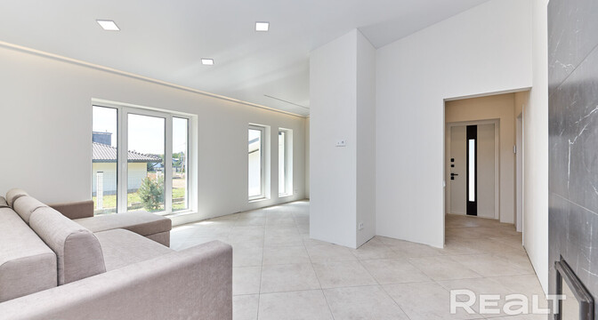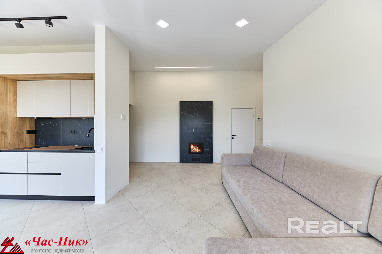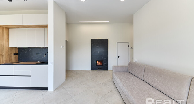 Из прихожей попадаем в гостиную-кухню с окнами в пол. Сбоку от диванной зоны расположена печь-камин.