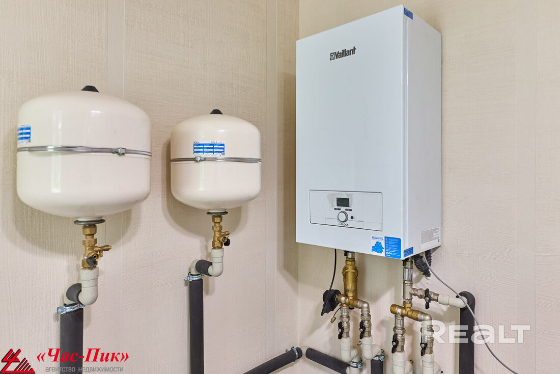 Отапливается дом электрокотлом с погодозависимой автоматикой и системой водяных теплых полов. Вода нагревается в бойлере. Не переживайте по поводу эксплуатационных расходов: это коттеджный поселок, поэтому электроэнергия считается по льготному тарифу, а это, между прочим, раз в 5 дешевле, чем если бы дом находился в СТ.