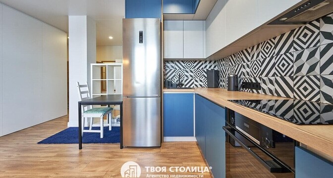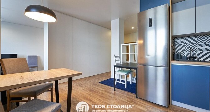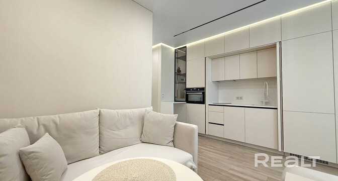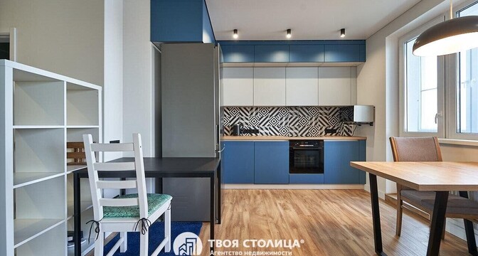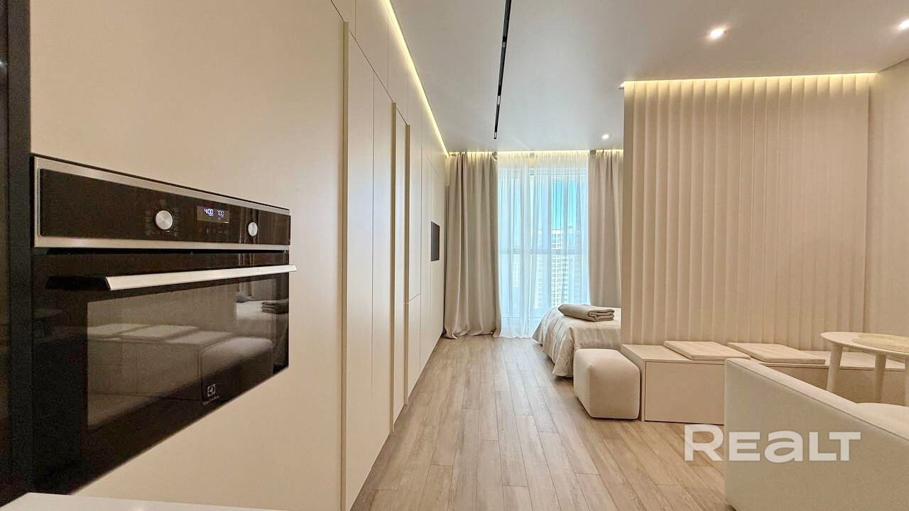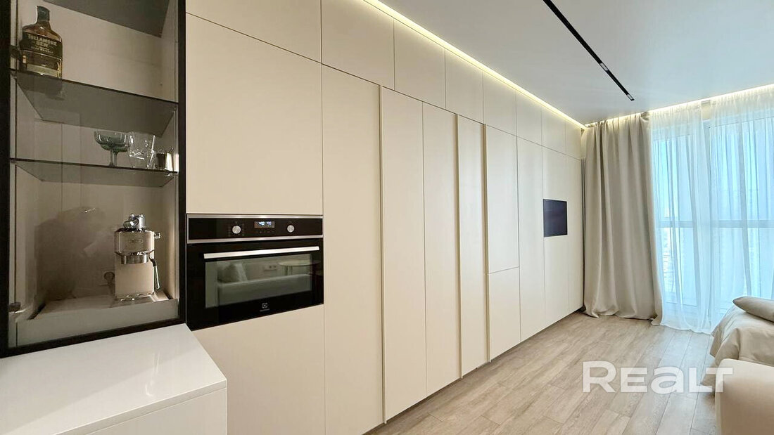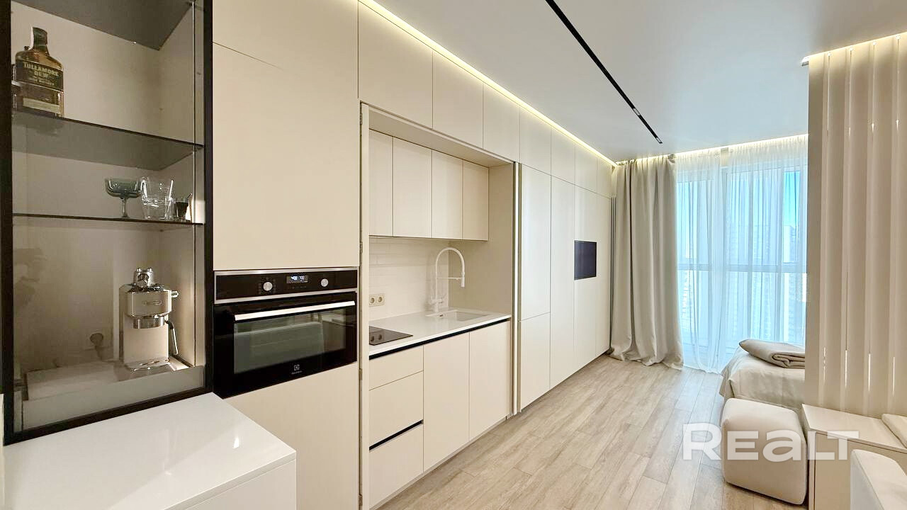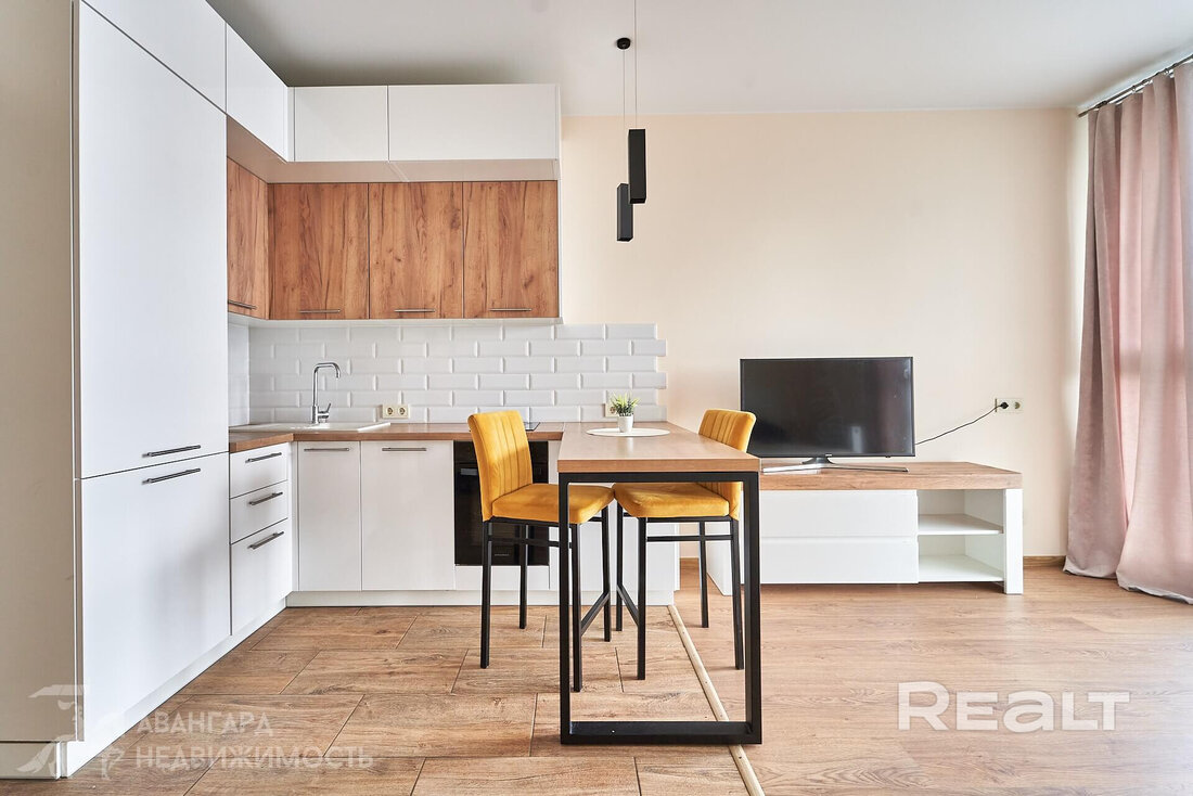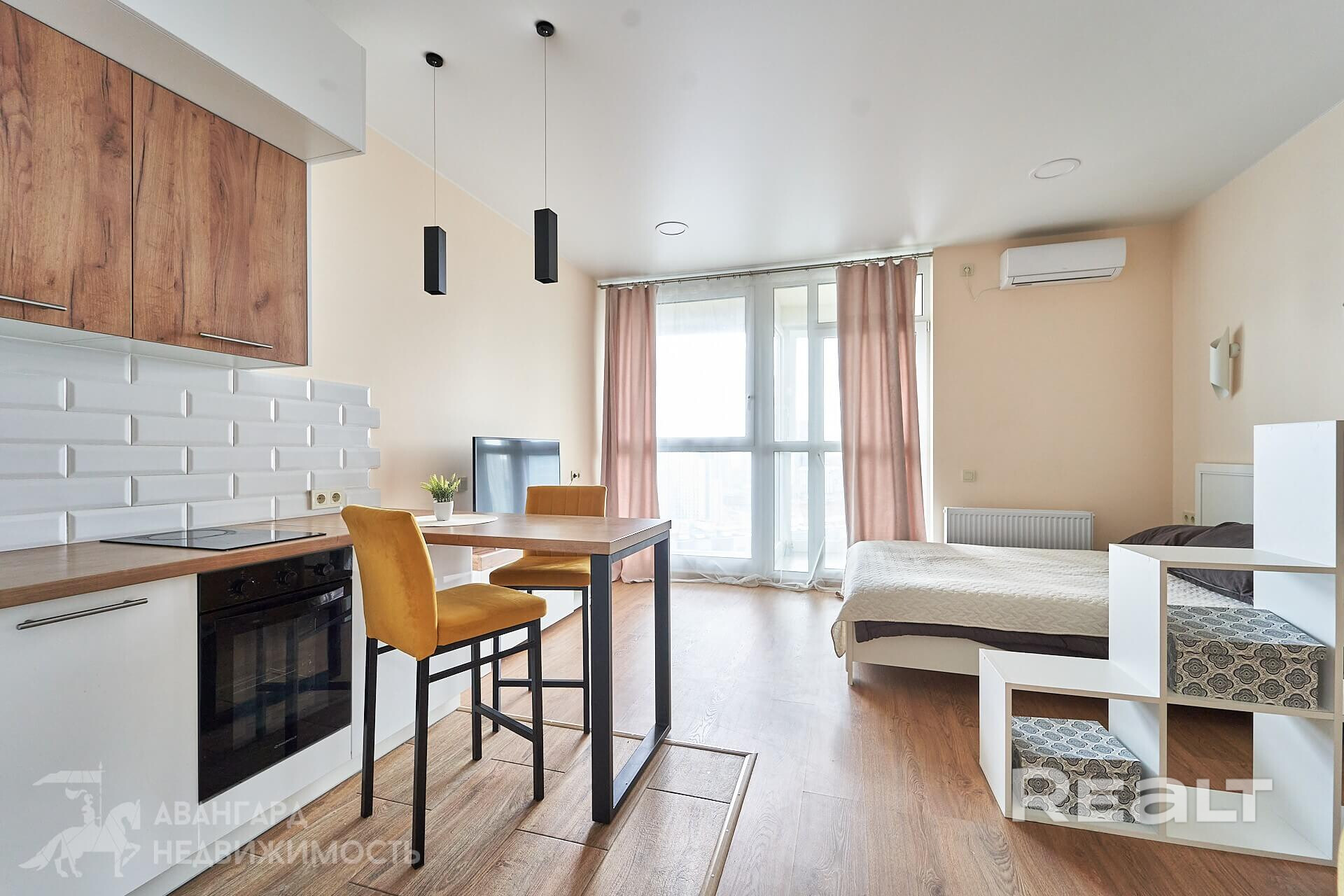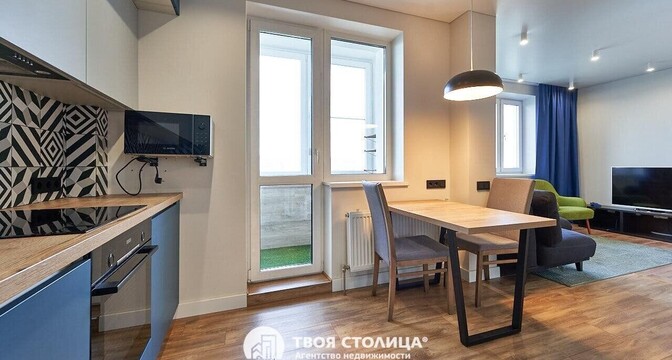 Еще один вариант из Минск-Мира — студия с классическим интерьером и необычной кухней. Находится на 22-м этаже 25-этажного дома «Фиджи» в квартале «Тропические острова». Дом сдан в 2023 году и расположен по адресу Жореса Алферова, 10.