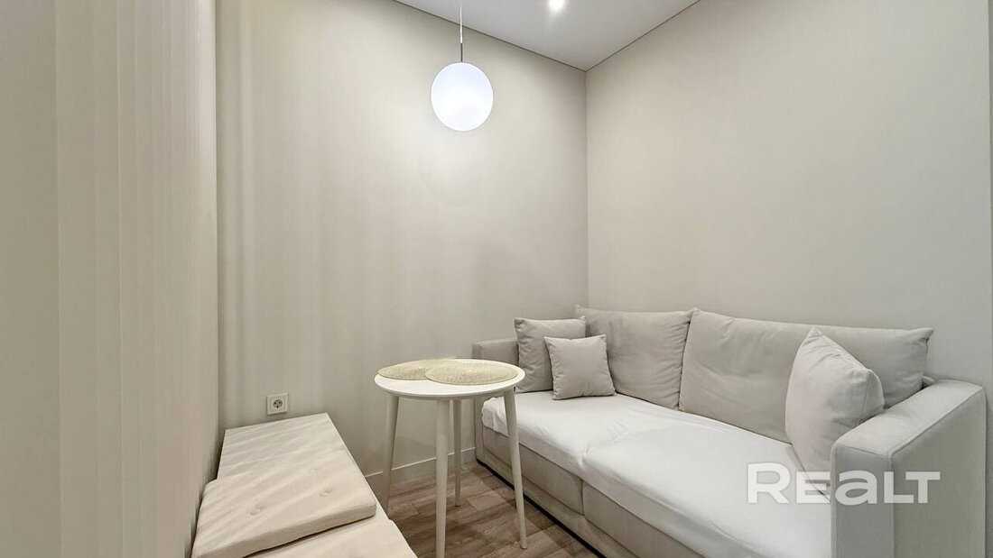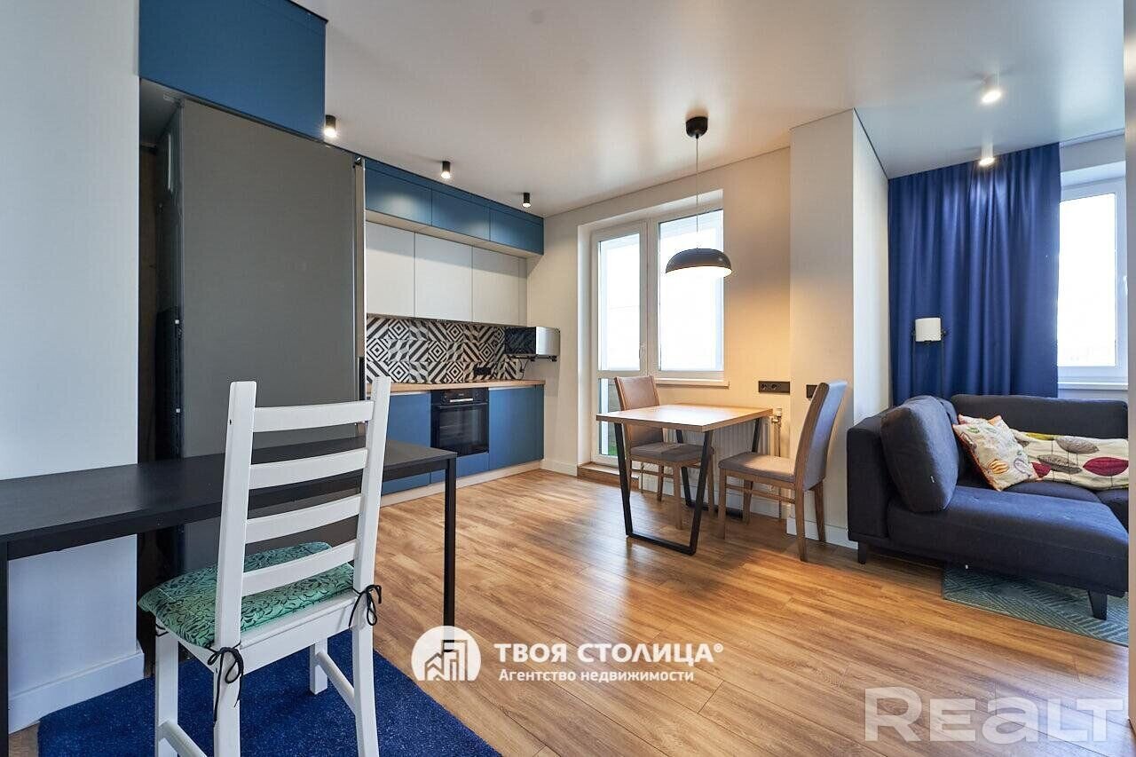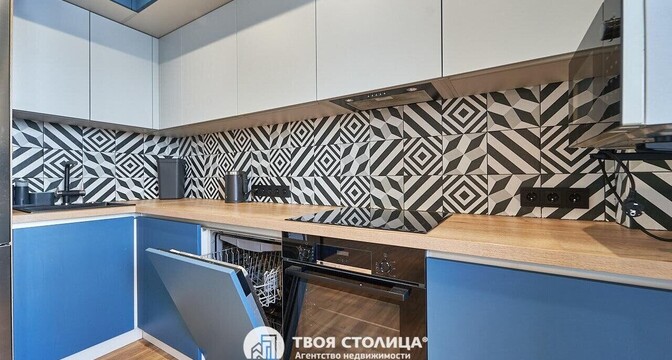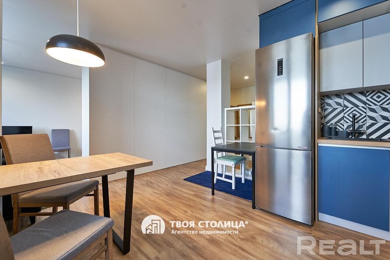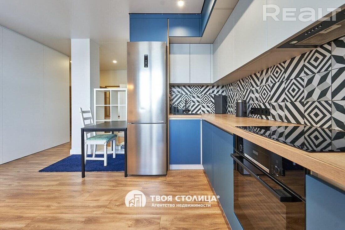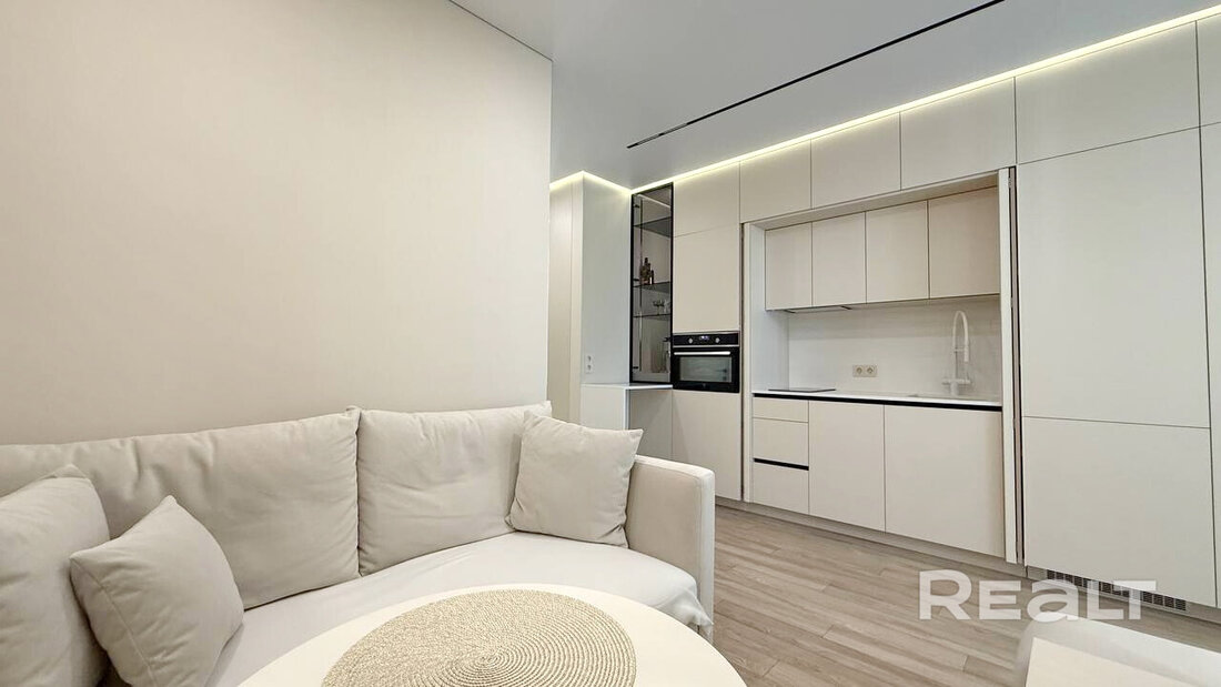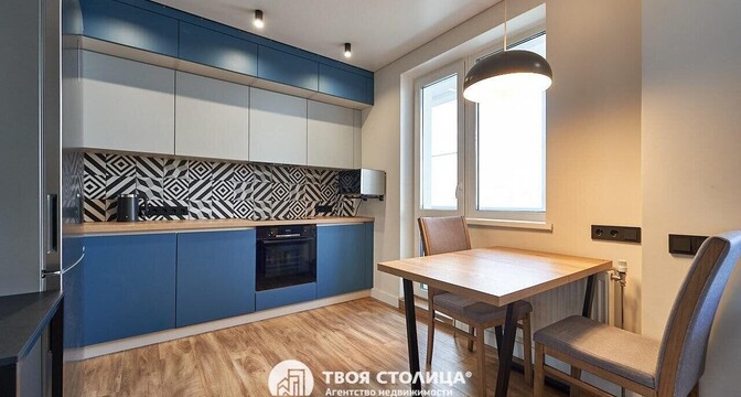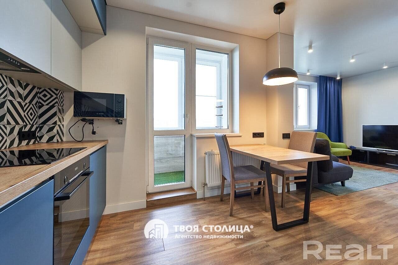 Еще один вариант из Минск-Мира — студия с классическим интерьером и необычной кухней. Находится на 22-м этаже 25-этажного дома «Фиджи» в квартале «Тропические острова». Дом сдан в 2023 году и расположен по адресу Жореса Алферова, 10.