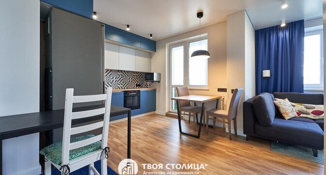 Площадь этой студии — 45 квадратов. В ней выполнен современный ремонт. На полу в зоне спальни ламинат, а в кухонной зоне и в коридоре — керамогранит. Потолки натяжные. Стены в квартире светлые, акцентный цвет — синий. Он используется в кухонных фасадах, мягкой мебели и текстиле.
