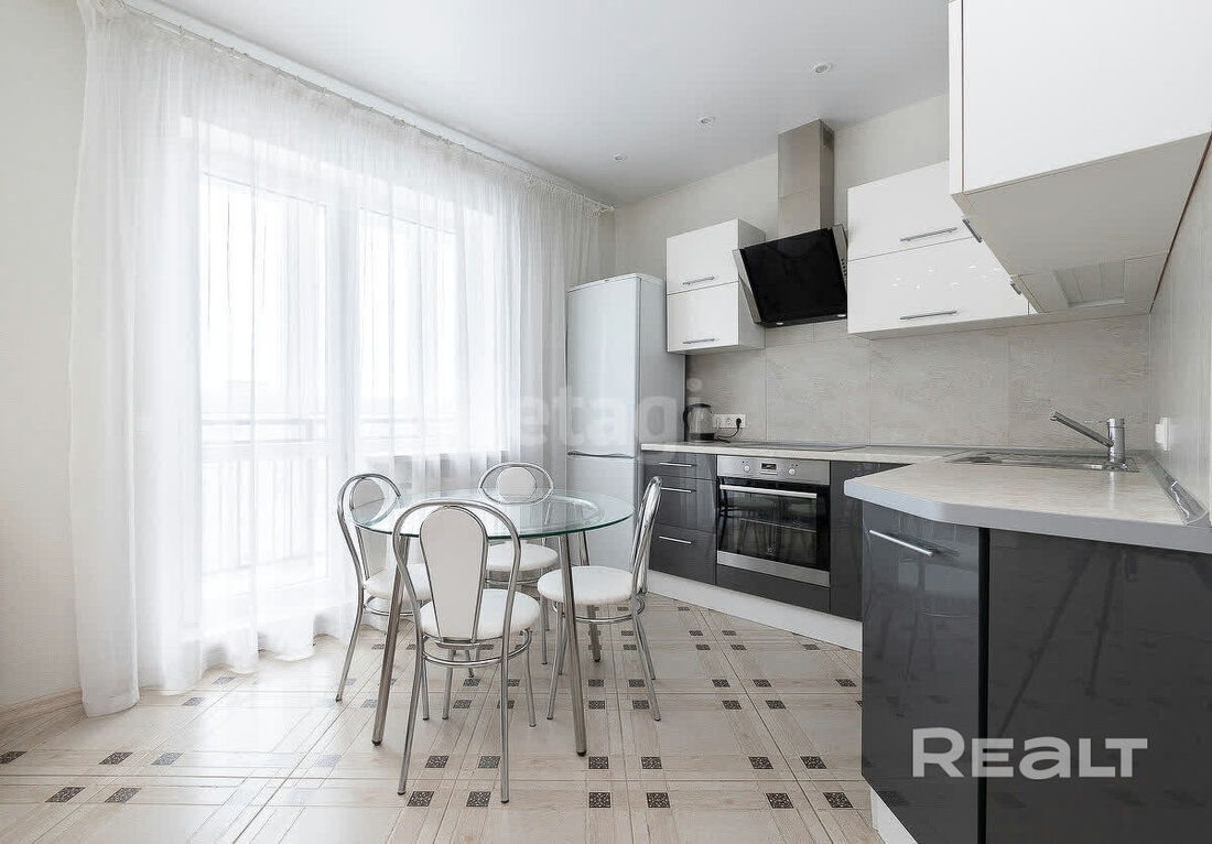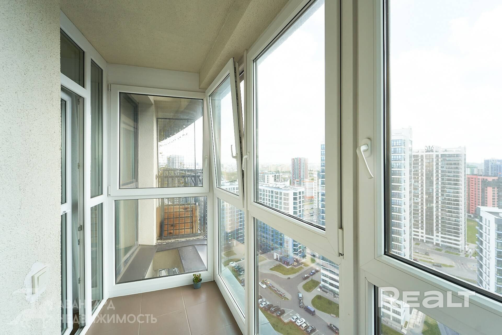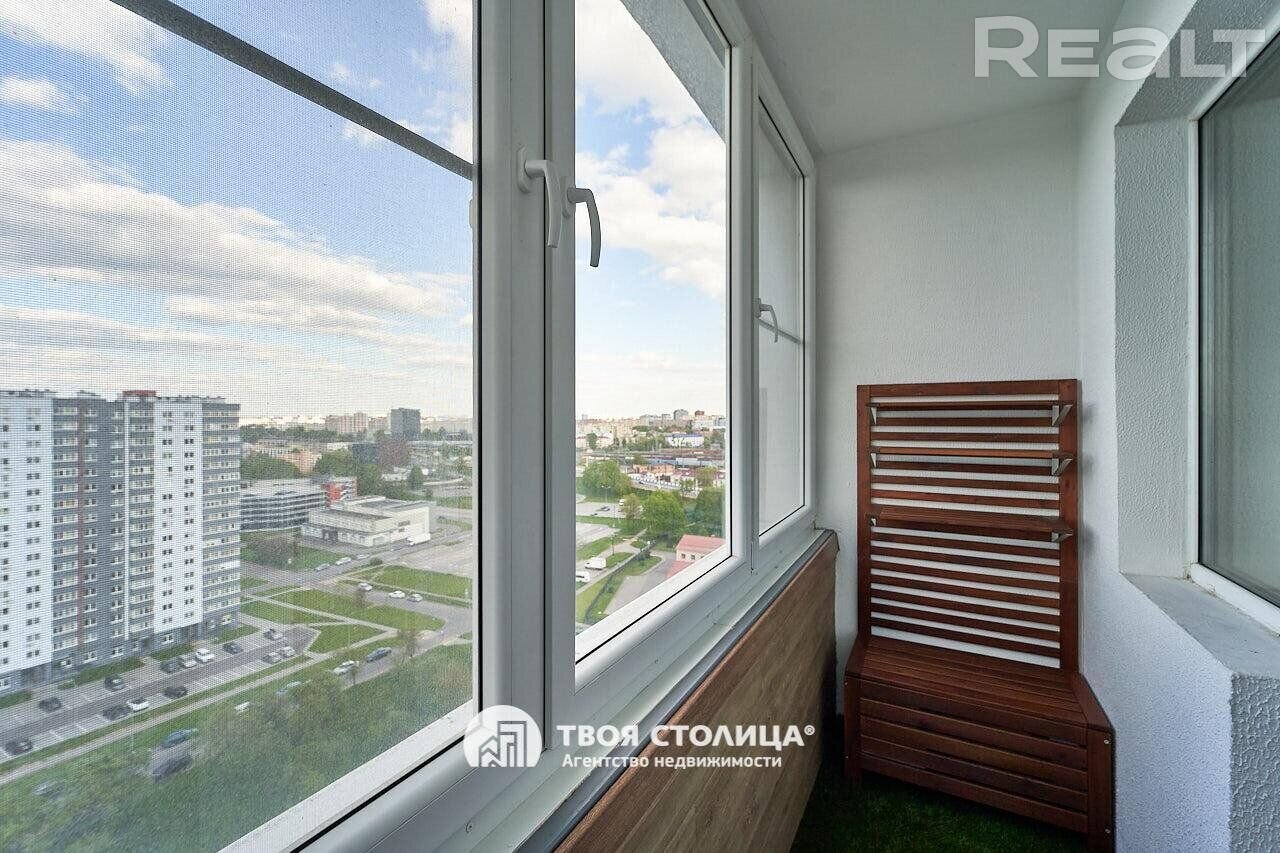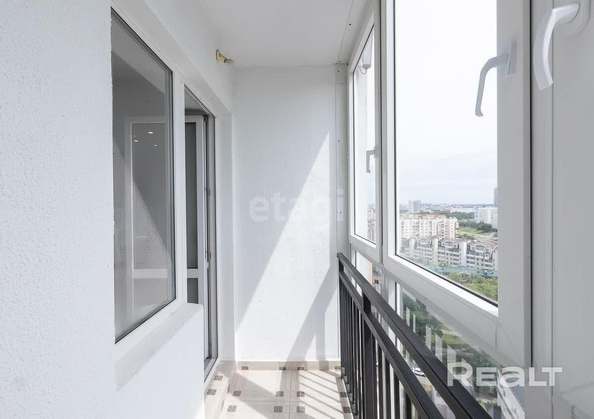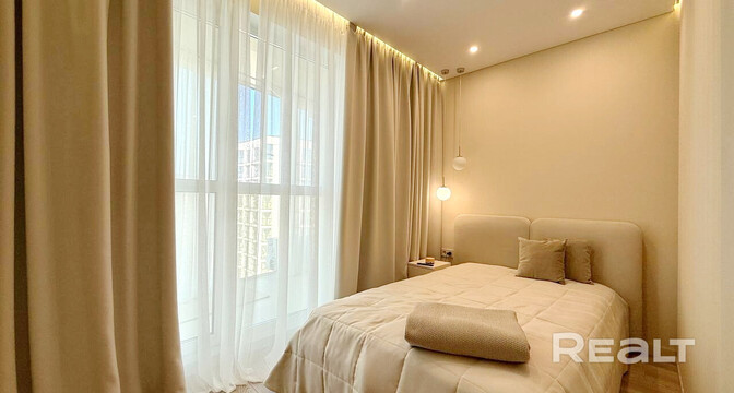 Квартира на 16-м этаже монолитного 19-этажного дома 2014 года постройки по адресу Репина, 4. Это ЖК «Чайковский». До станции метро «Молодежная» около 10-15 минут пешком. Одну остановку можно подъехать на маршрутке. До проспекта Машерова — буквально один дом.
