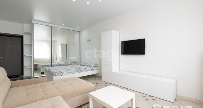 Общая площадь квартиры — 42 квадрата, жилая — 30. Ремонт выполнен в светлых тонах. Зона гостиной формально отделена от кухни большим диваном рядом с которым на стене висит телевизор. Есть место и для двуспальной кровати. В комнате установлен шкаф-купе.