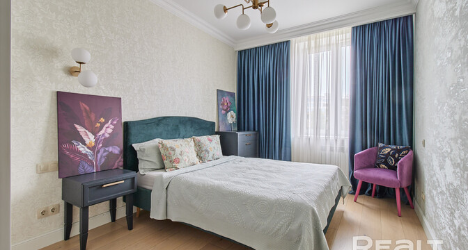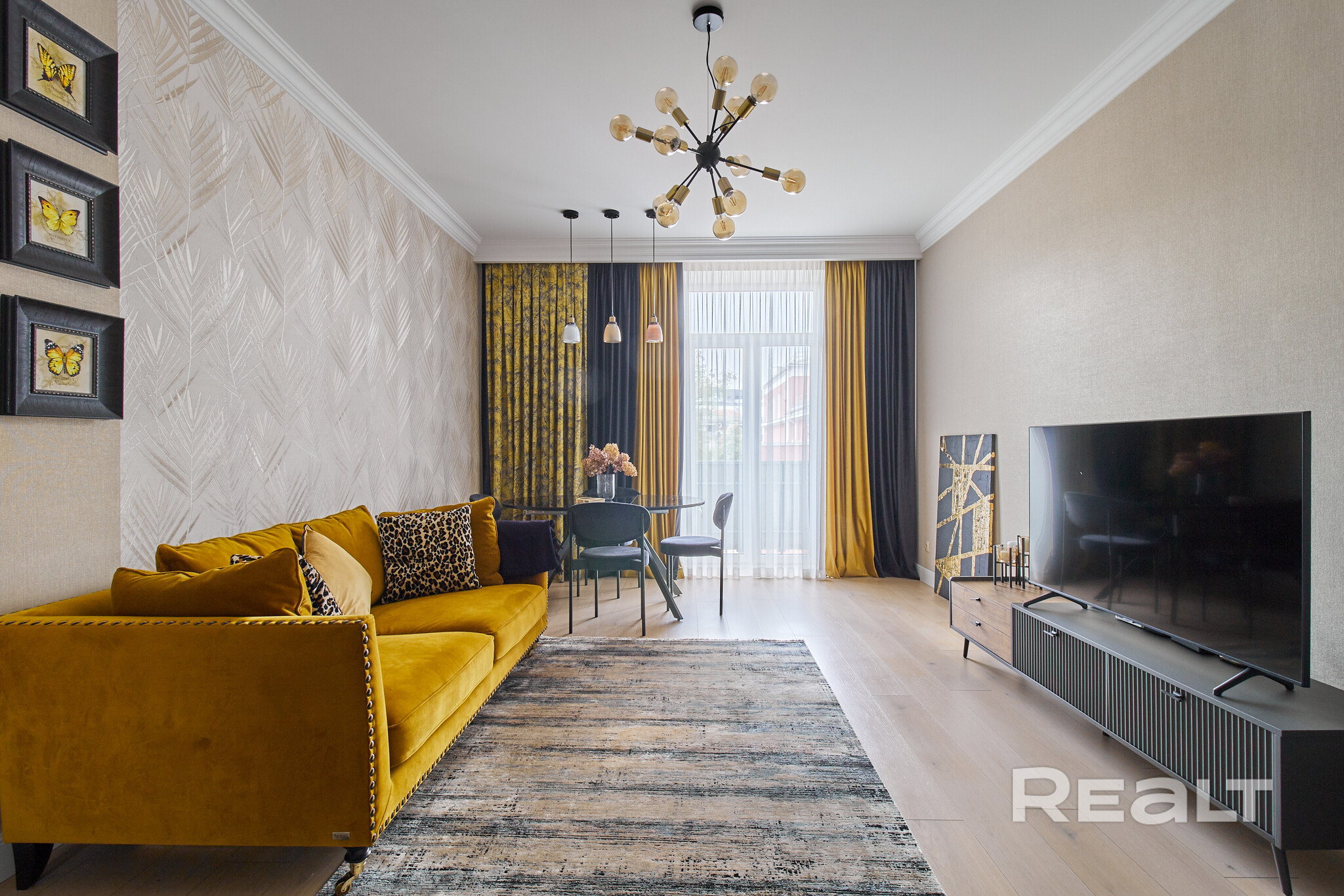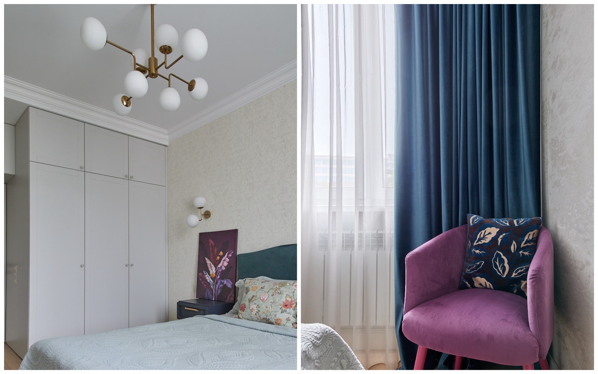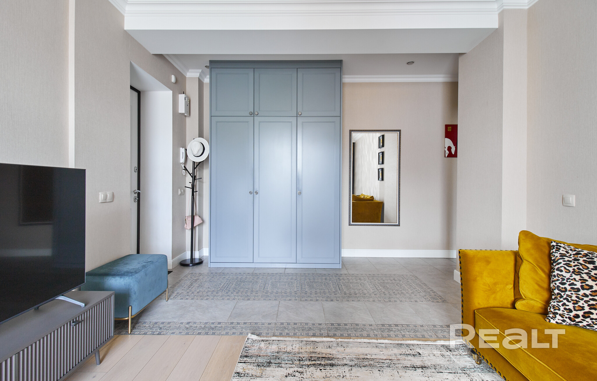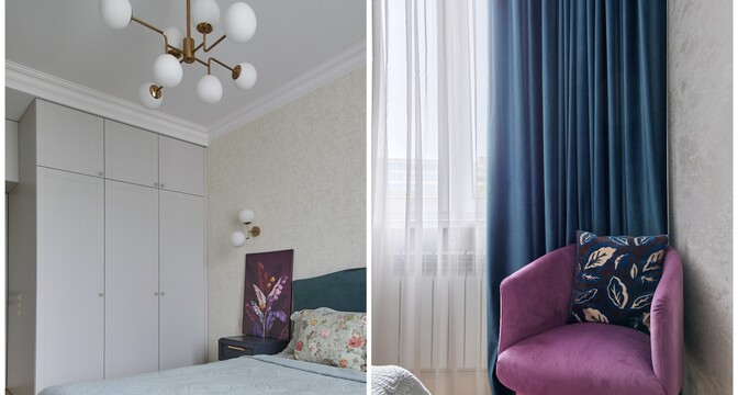 В квартире две изолированные спальни, а гостиная совмещена с прихожей. Все окна жилых комнат выходят во двор. Трешка обставлена яркой мебелью Furman.