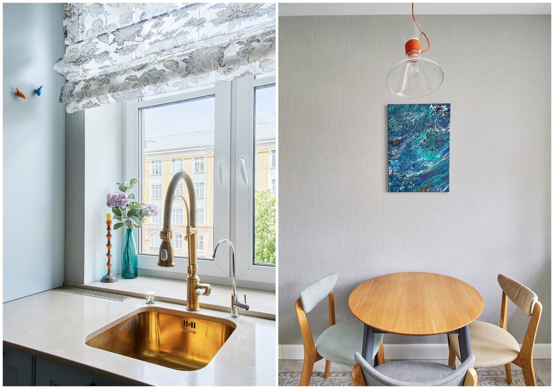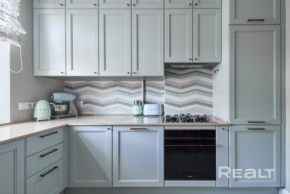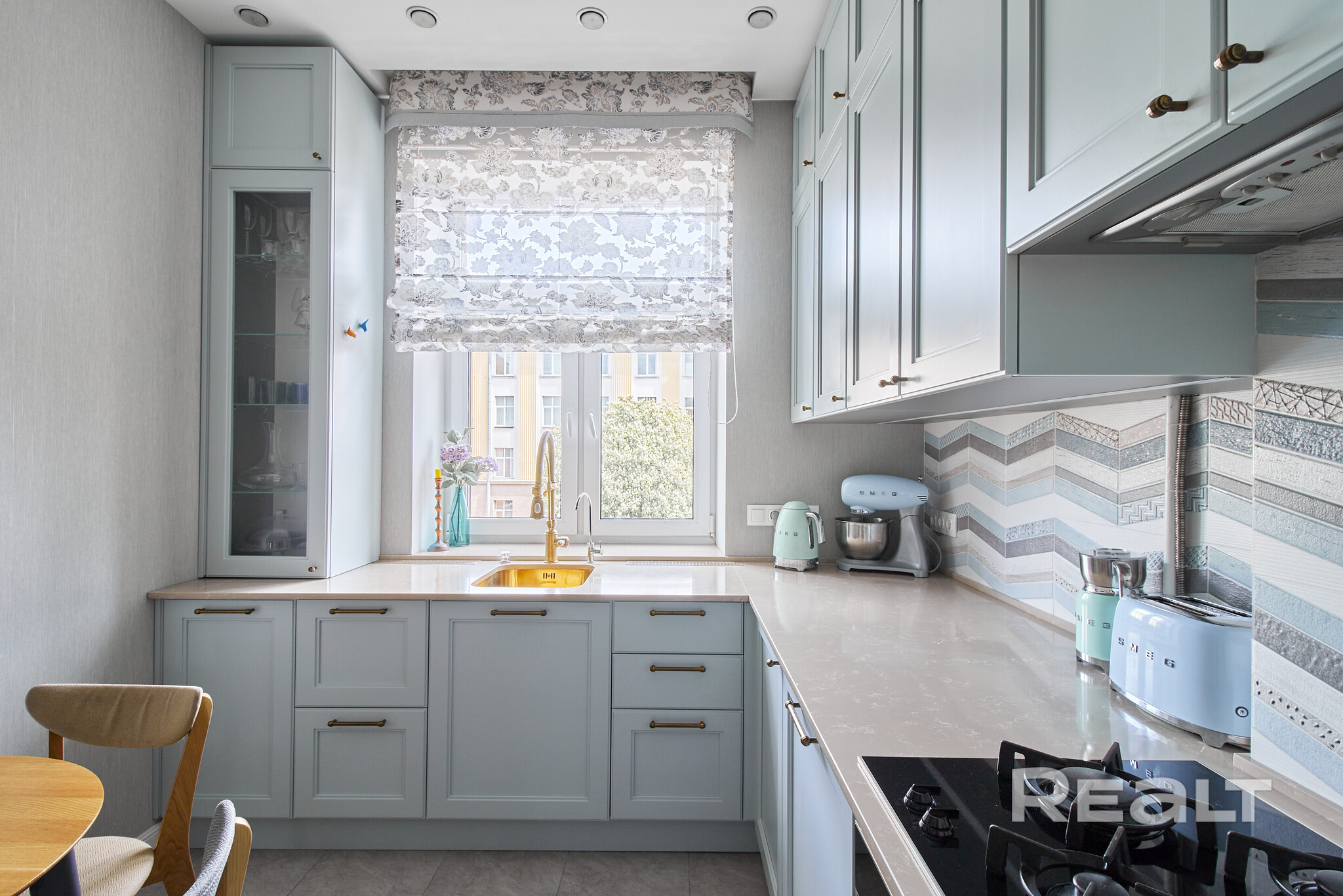 Здесь сделан светлый ремонт. В кухне установлен гарнитур, есть бытовая техника бренда Smeg.