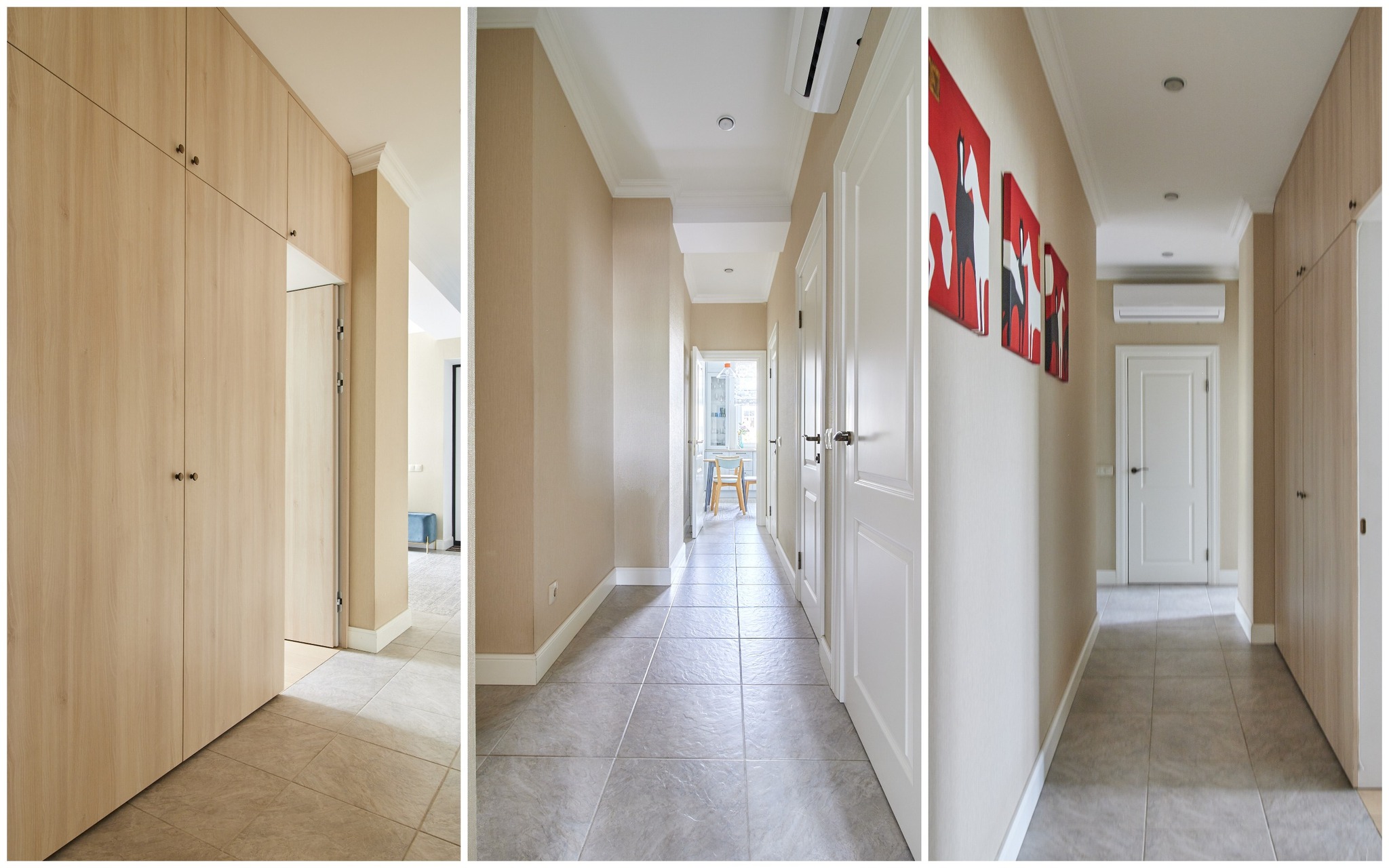 В одной комнате обустроена спальня, во второй — детская. В каждом помещении есть места для хранения вещей. На полу лежат итальянская плитка и паркет.