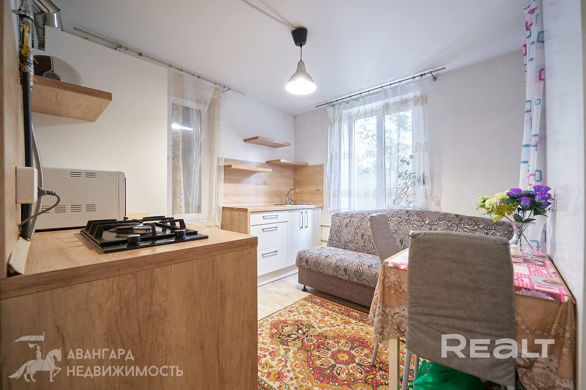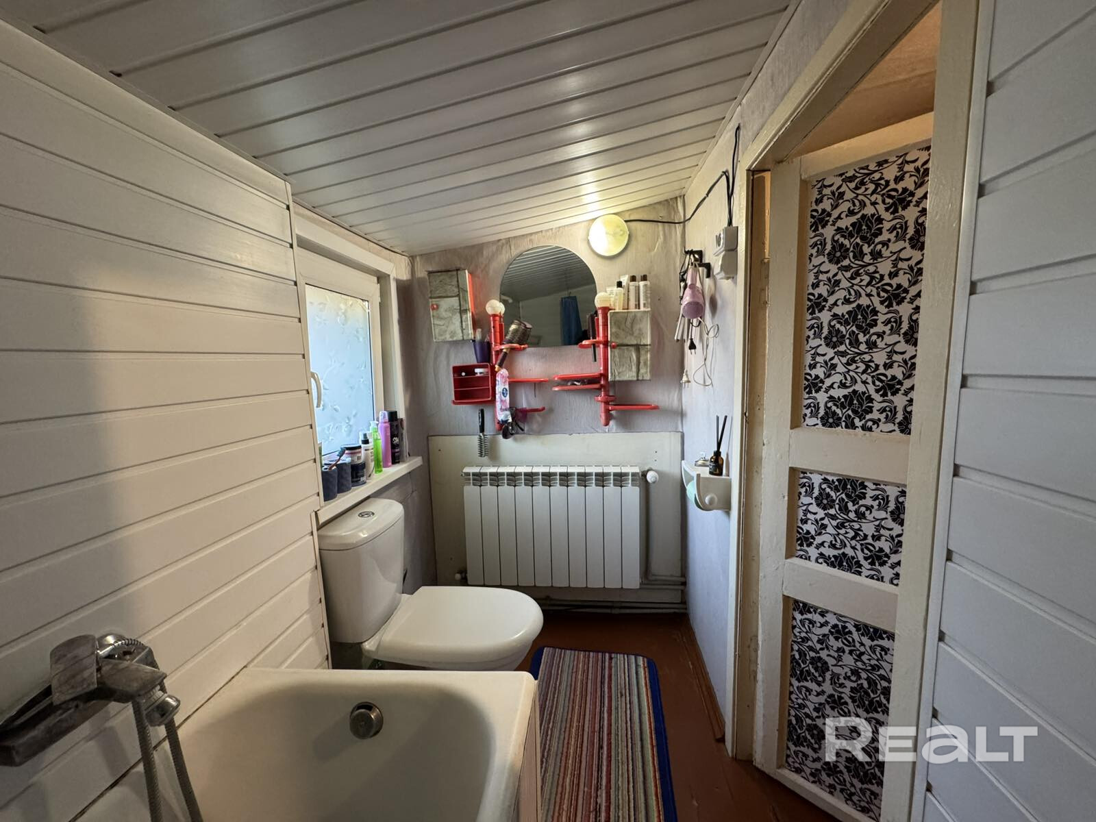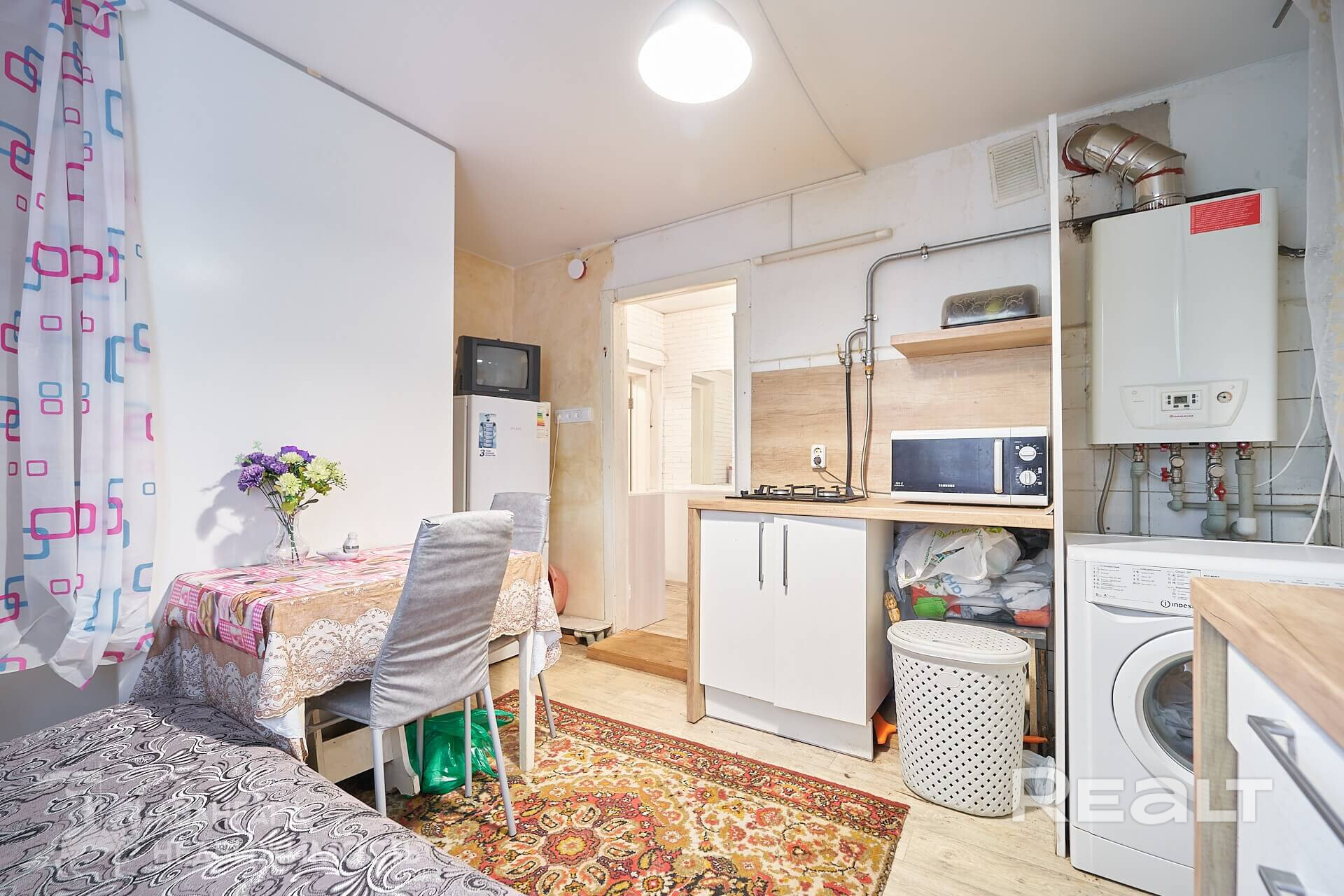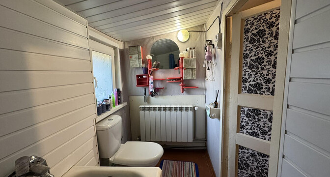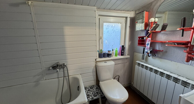 Общая площадь — 36 квадратов, жилая — 21, метраж кухни — 8 квадратов. В доме деревянные полы. Все коммуникации центральные, отопление газовое, котел Bosch, установлены радиаторы с терморегуляторами. В совмещенном санузле установлена ванна, есть небольшое окно.