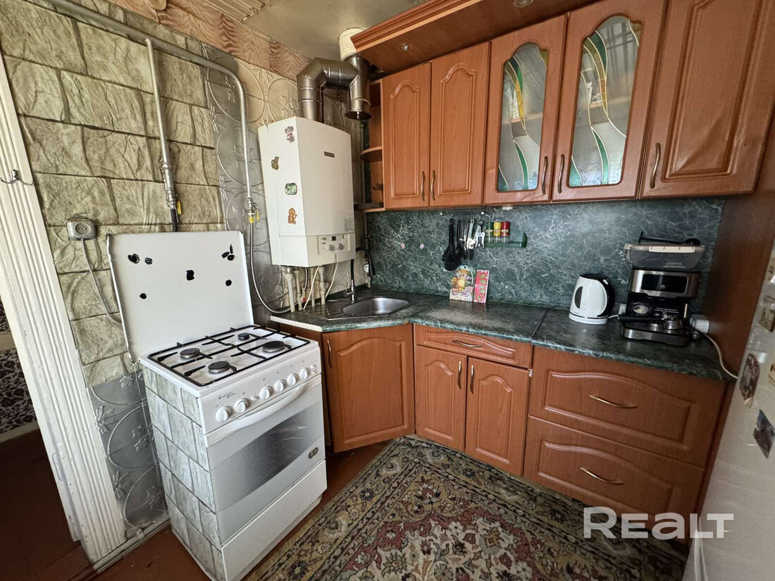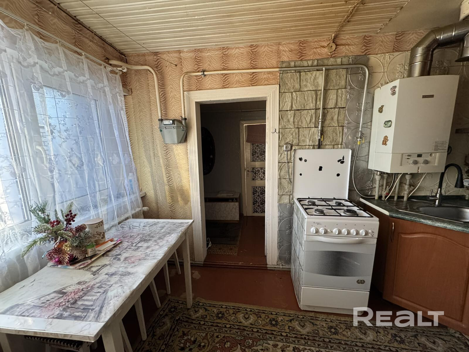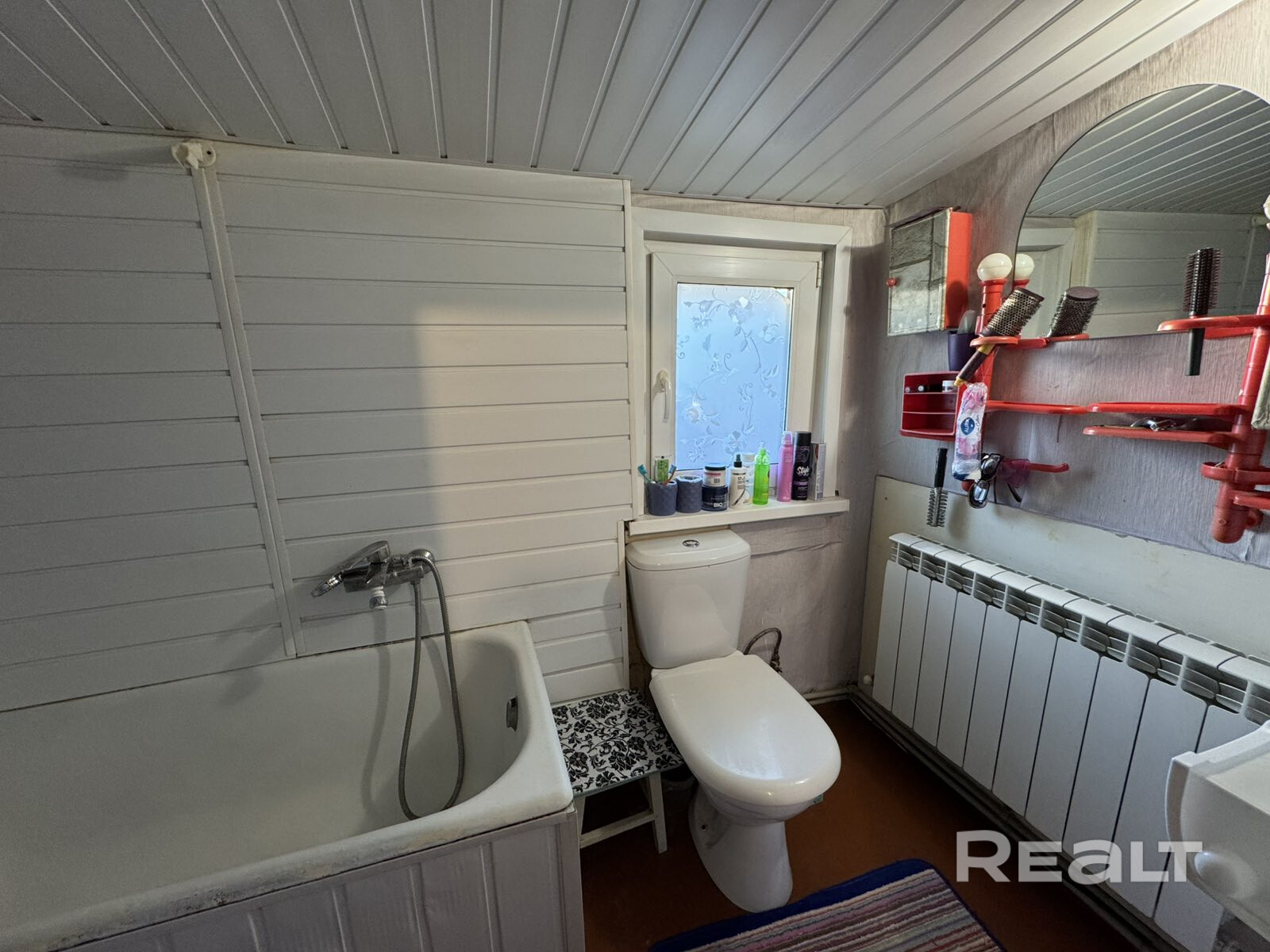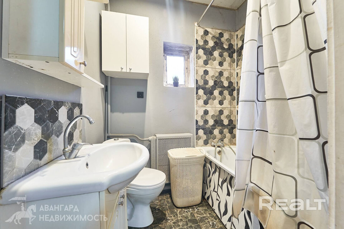 Общая площадь — 36 квадратов, жилая — 21, метраж кухни — 8 квадратов. В доме деревянные полы. Все коммуникации центральные, отопление газовое, котел Bosch, установлены радиаторы с терморегуляторами. В совмещенном санузле установлена ванна, есть небольшое окно.