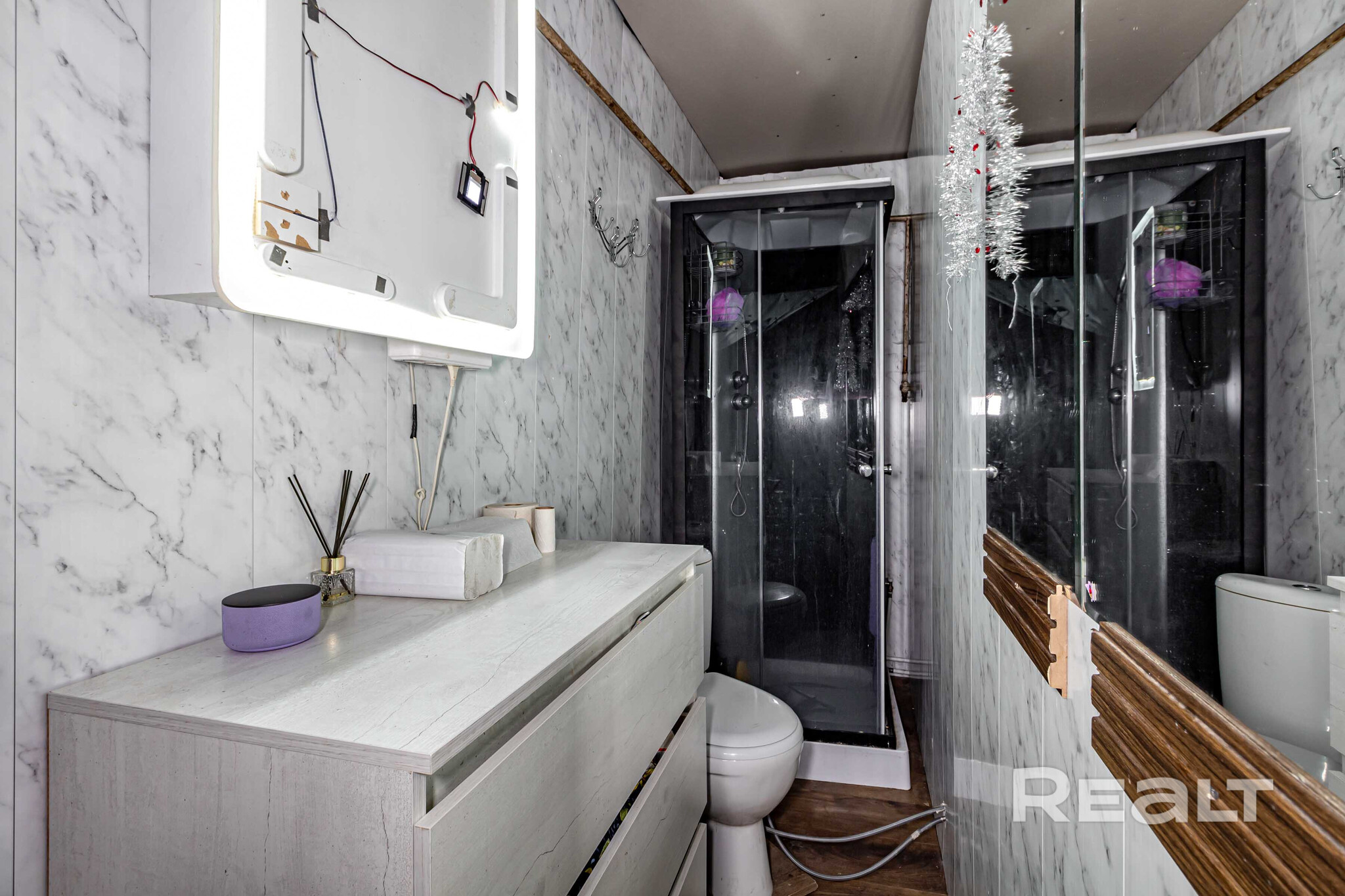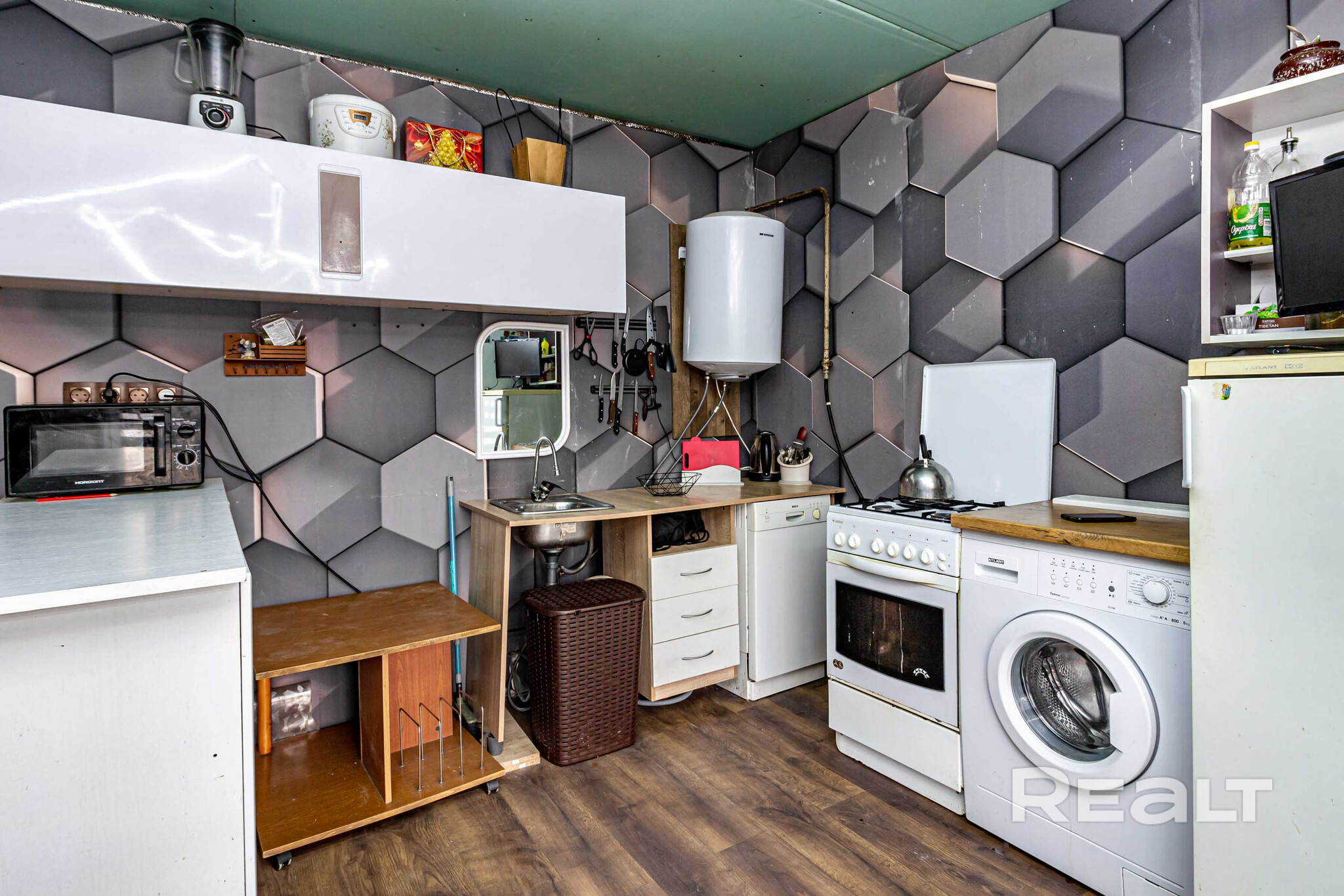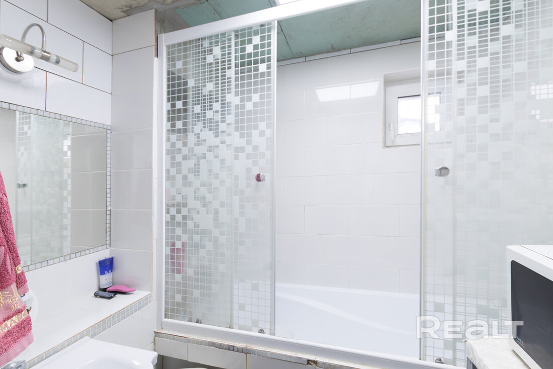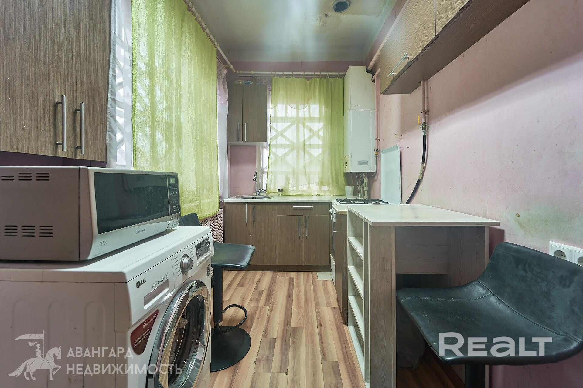 Общая площадь — 36 квадратов, жилая — 21, метраж кухни — 8 квадратов. В доме деревянные полы. Все коммуникации центральные, отопление газовое, котел Bosch, установлены радиаторы с терморегуляторами. В совмещенном санузле установлена ванна, есть небольшое окно.