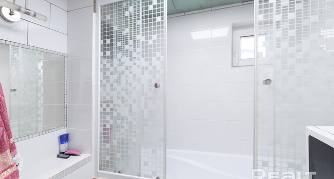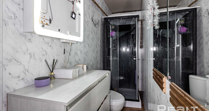 Общая площадь дома — 90 квадратов, 64 из которых жилые, а 8 метров занимает кухня. В доме два уровня, второй — мансардный. Местами придется сделать ремонт. Отопление на газу, все коммуникации центральные. Санузел раздельный. Установлена ванна, подключена стиральная машина.