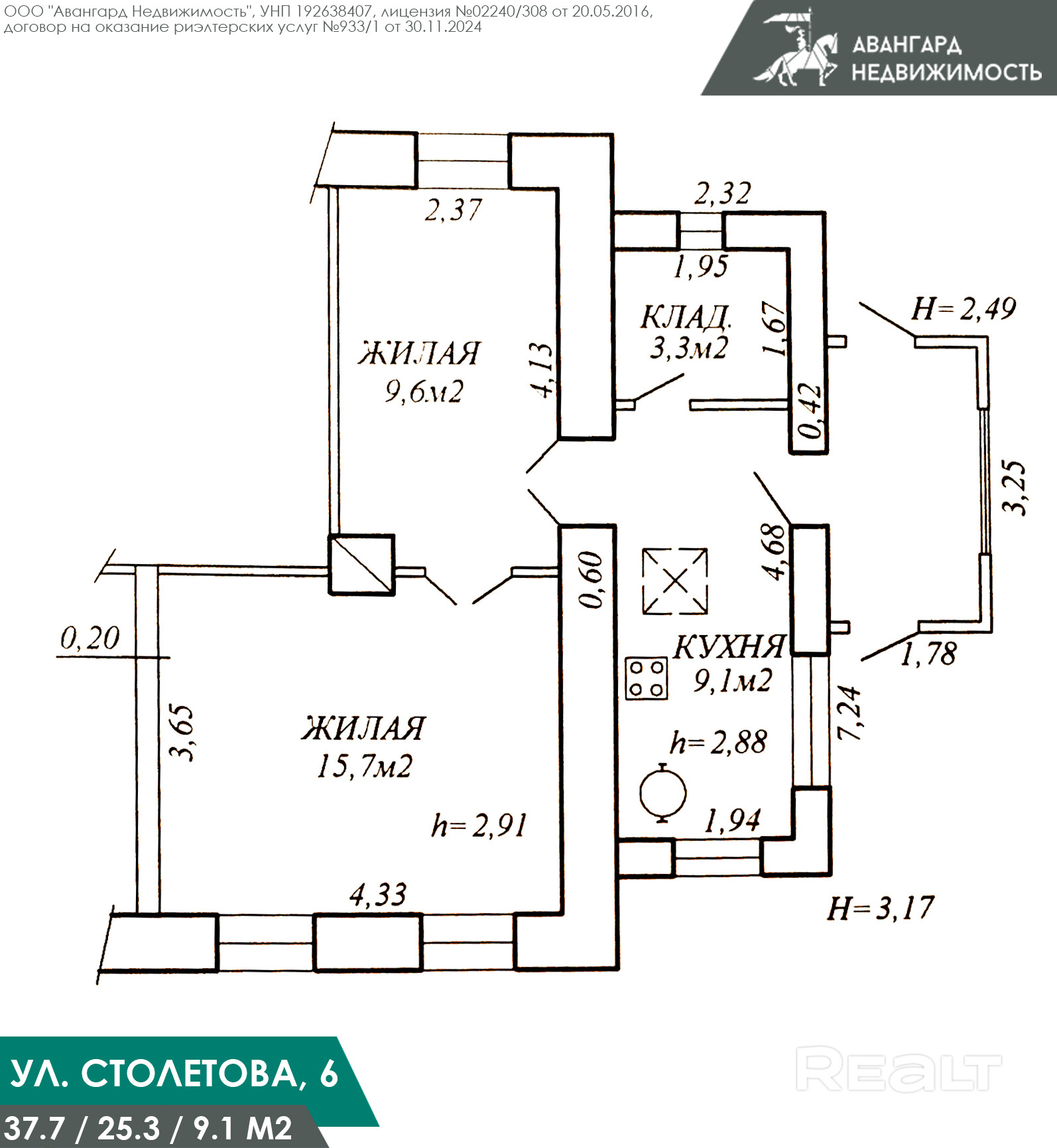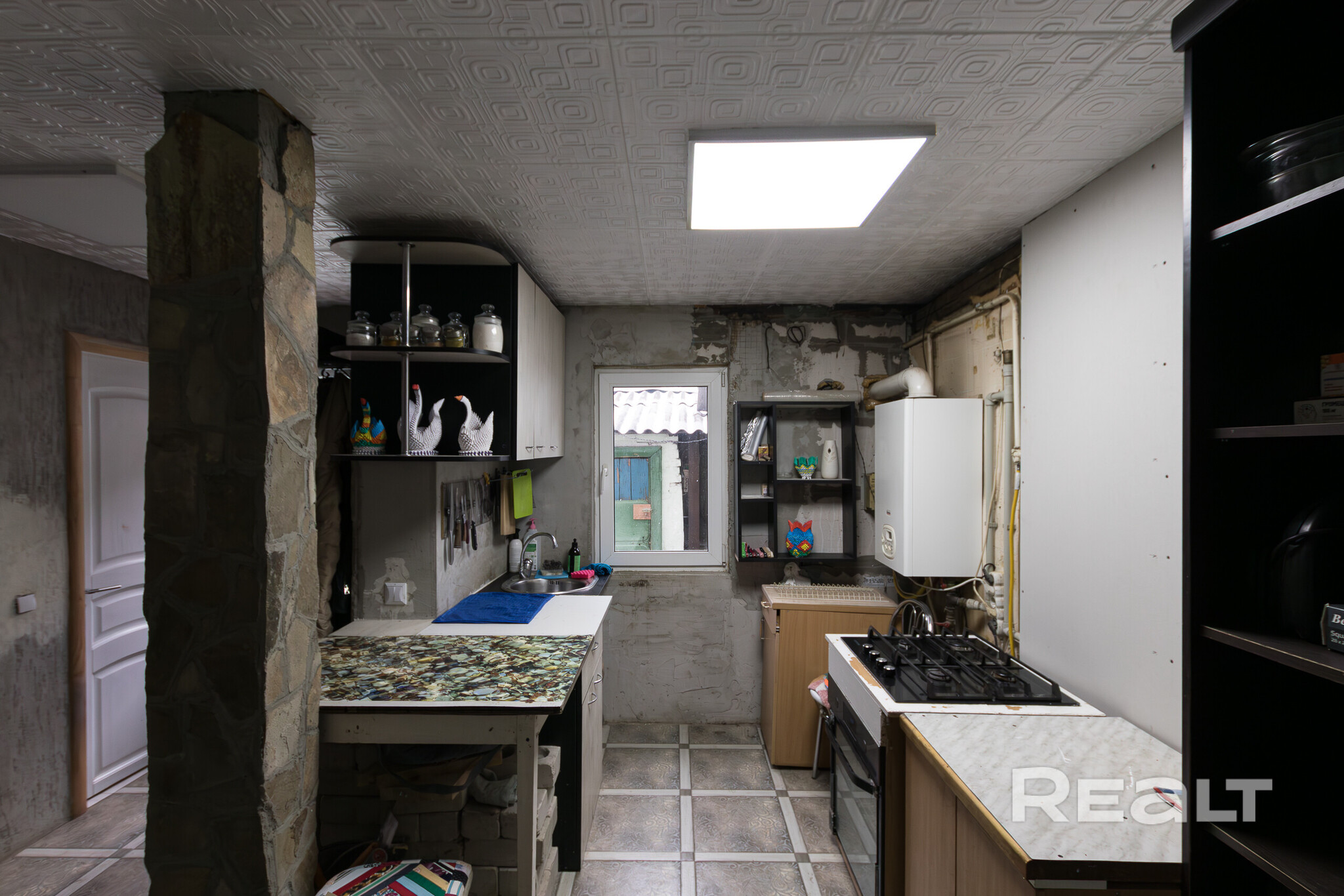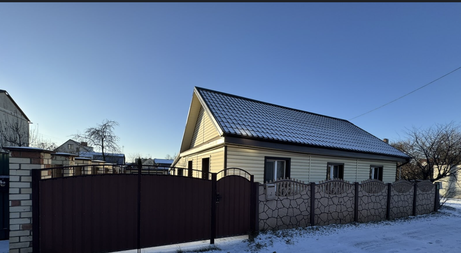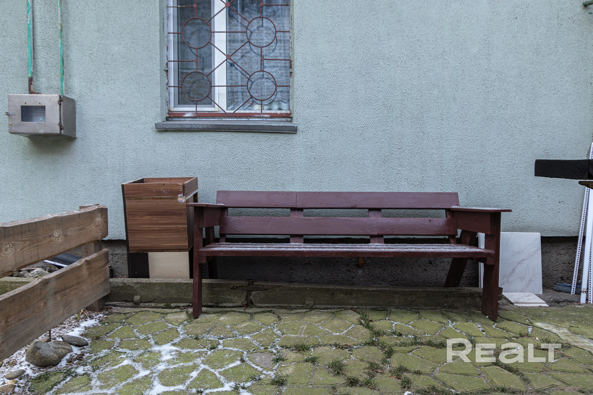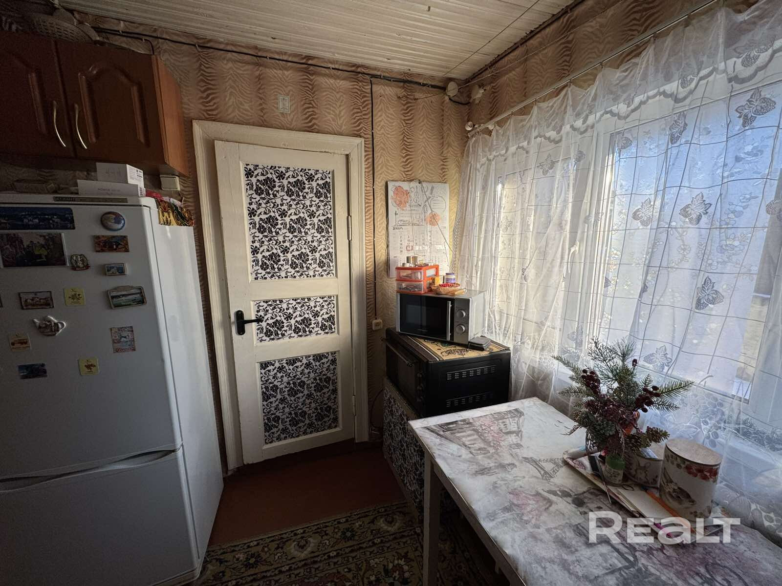 Построен кирпичный дом в 1950 году, крыша покрыта шифером. Высота потолков — 2,84 метра. Общая площадь — 40 квадратов, жилая — 24 (комнаты — 9 и 15 метров), кухня — 8 квадратов. На полу — ламинат, на стенах в жилых комнатах обои, а в прихожей декоративный камень.