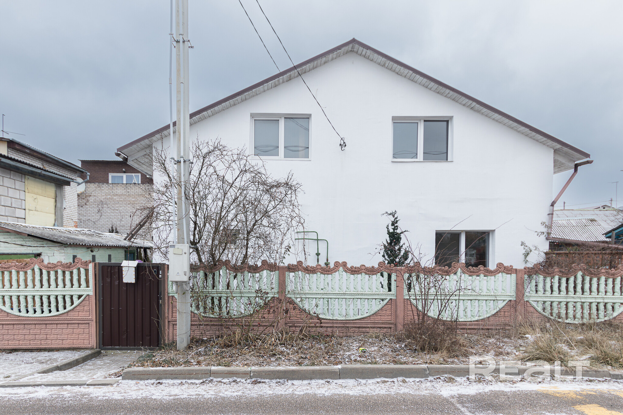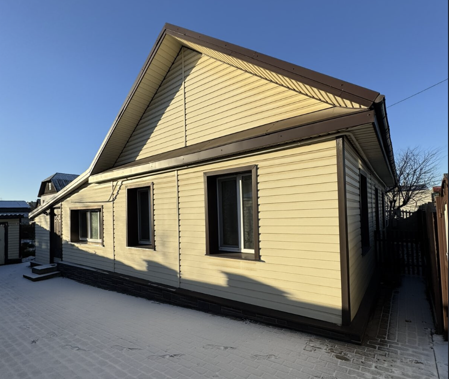 Дом блокированный, построен из кирпича в 1956 году. Есть отапливаемая пристройка, беседка и сарай. Крыша — из шифера. Есть мансарда, но там нет ремонта.