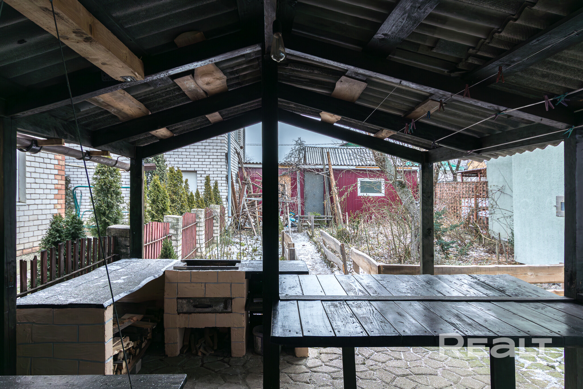 Участок — 1, 7 сотки. Двор вымощен плиткой, есть уличное освещение.