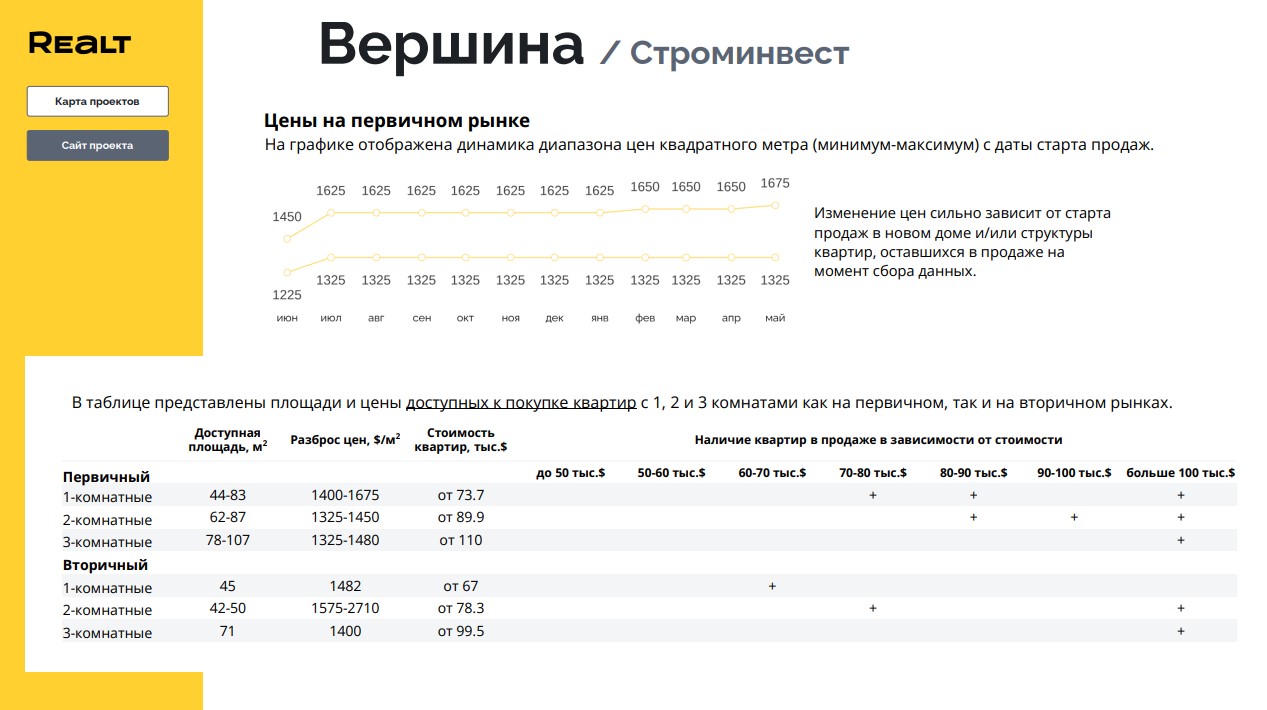 Каждому жилому комплексу там посвящено несколько слайдов с ценами на первичке и на вторичке. Вот как выглядит один из слайдов для одного из ЖК в обзоре: