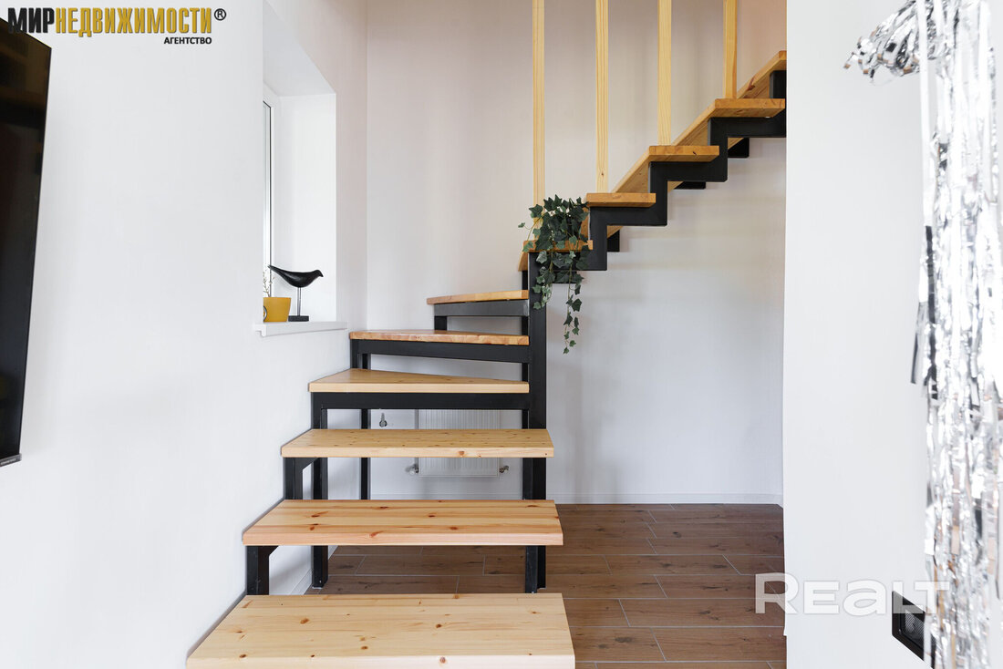 Двухэтажный коттедж насчитывает 107 квадратных метров общей площади. На первом этаже уложена плитка, под которой есть водяной теплый пол. На втором этаже положен ламинат. Потолки в доме сделаны из гипсокартона.