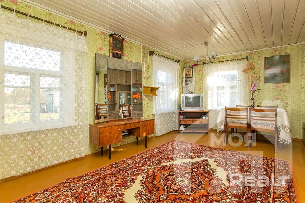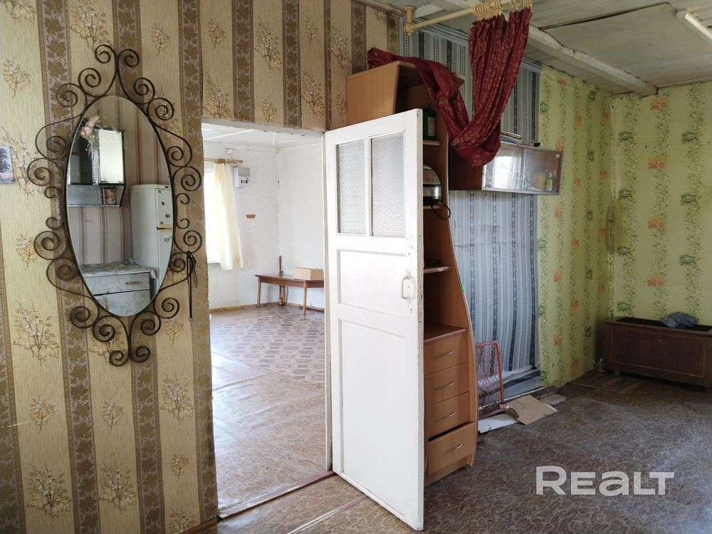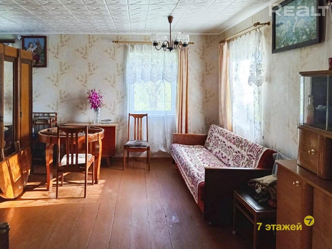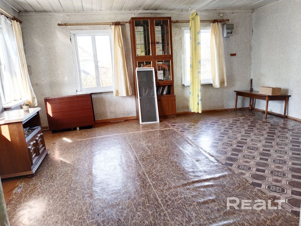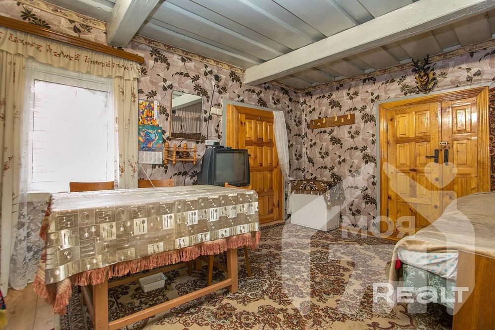 Здесь можно присмотреться к деревянному дому на 63 квадрата. Внутри кухня и большая комната, которую можно при желании разделить на несколько. Состояние приличное, от лишней мебели и старых вещей уже избавились.