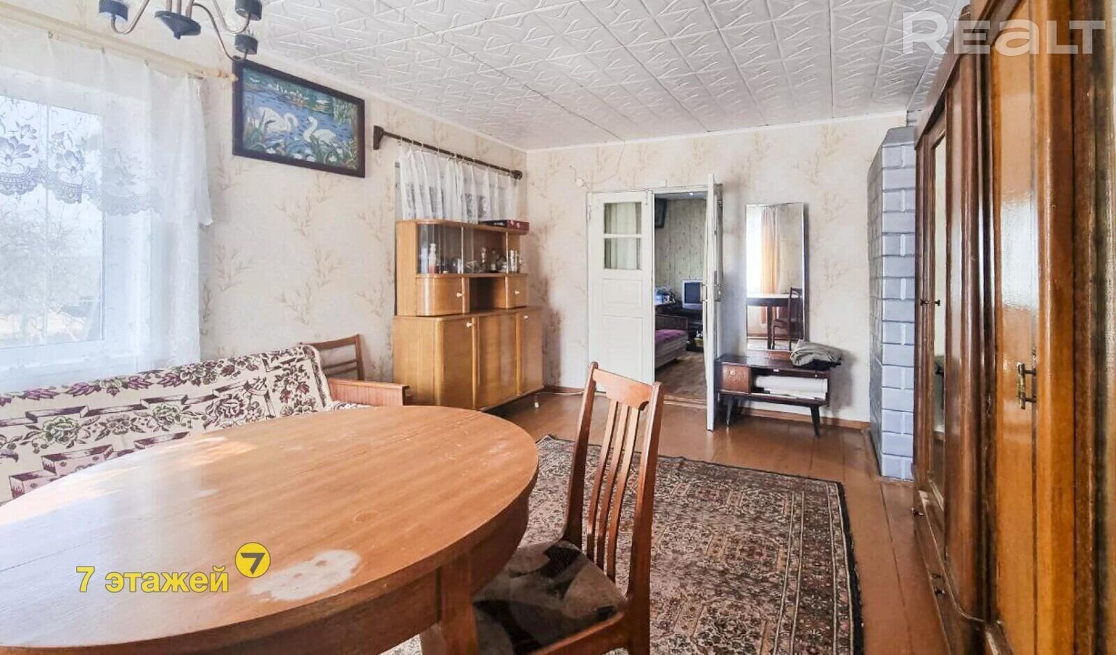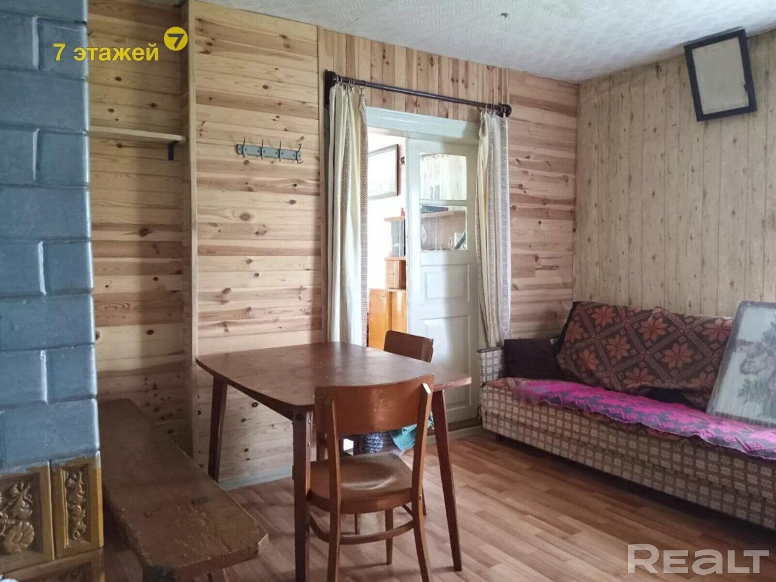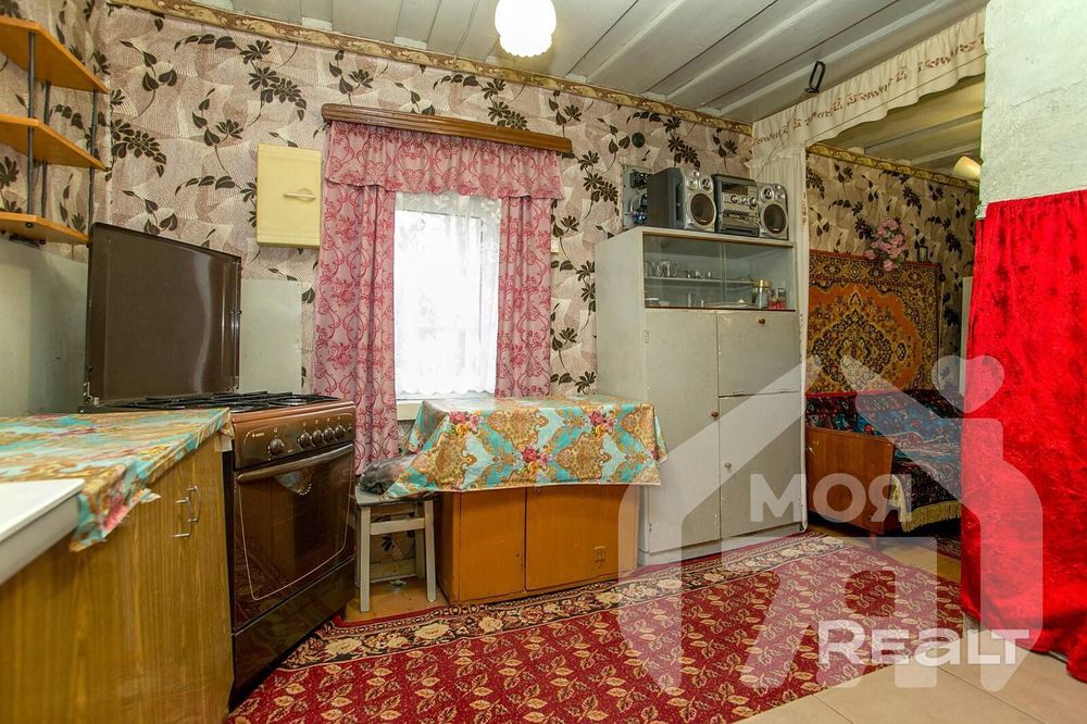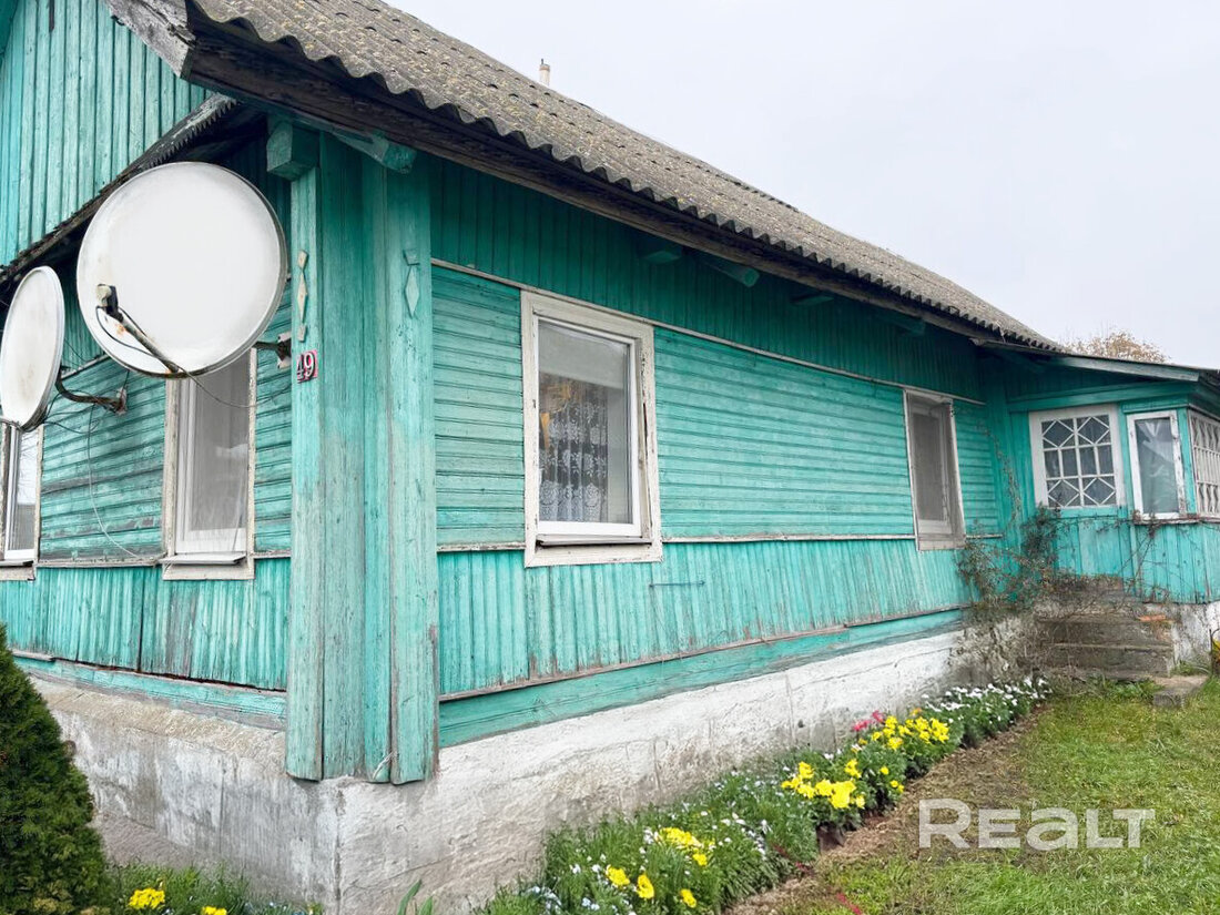 Здесь можно присмотреться к деревянному дому на 63 квадрата. Внутри кухня и большая комната, которую можно при желании разделить на несколько. Состояние приличное, от лишней мебели и старых вещей уже избавились.