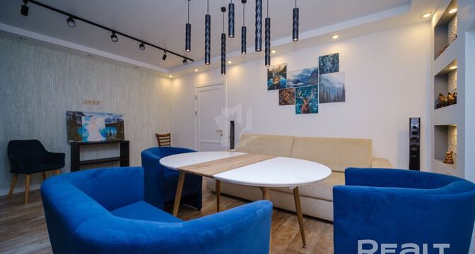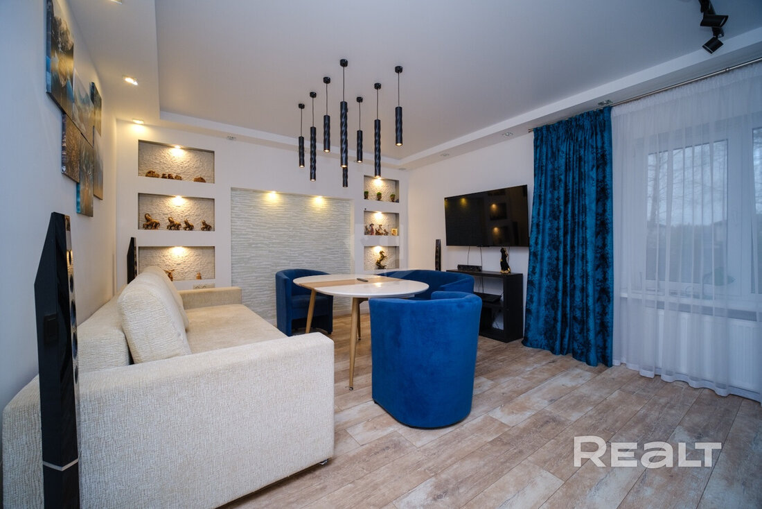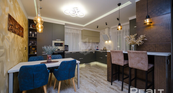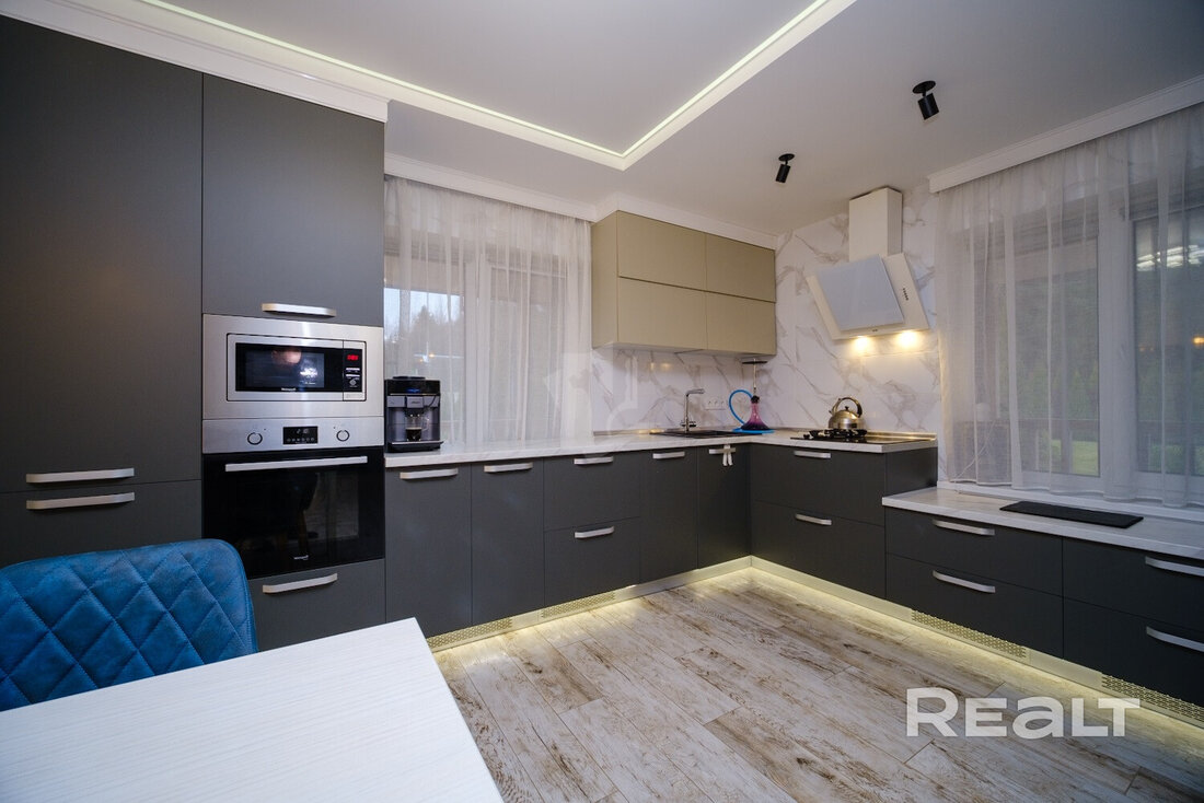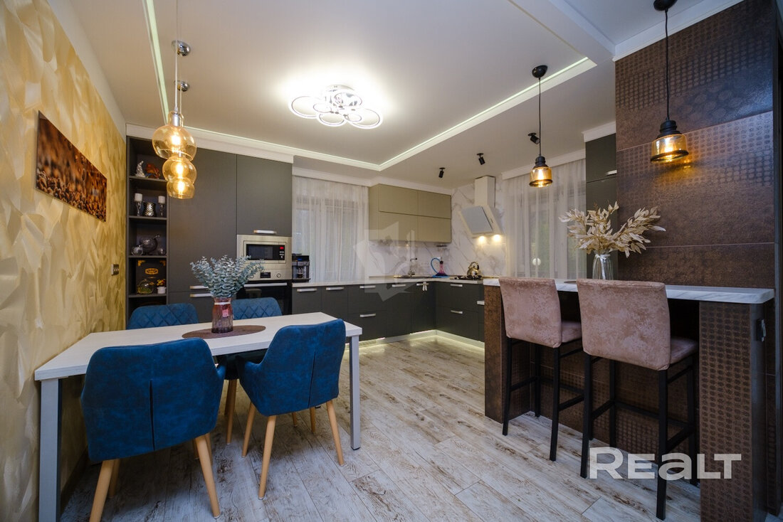 Внутри сделан хороший ремонт. Комнаты обставлены яркой мебелью и техникой. Собственники не пожалели места на кухню-столовую. Здесь много мест для хранения, есть много рабочих поверхностей, установлена техника. Также предусмотрено несколько обеденных зон.