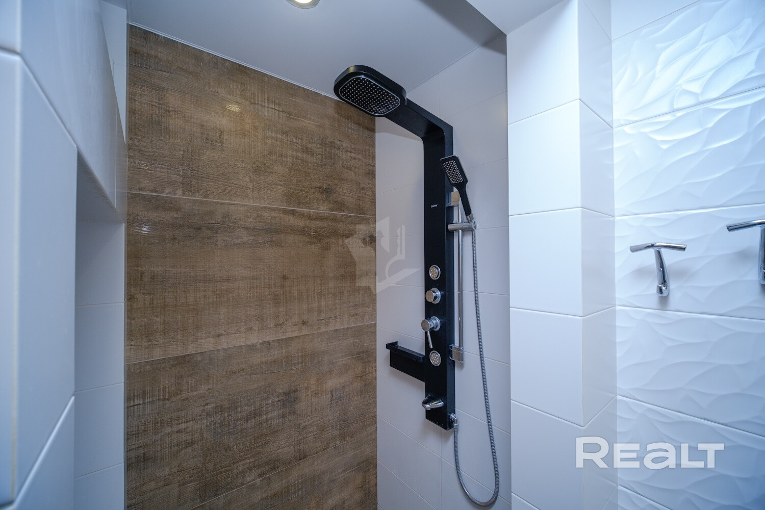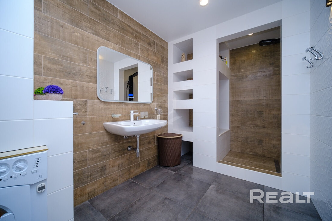 В доме обустроен просторный санузел. Отопление идет от электрического котла, сделаны теплые полы. Вода введена из скважины. Канализация — местная.