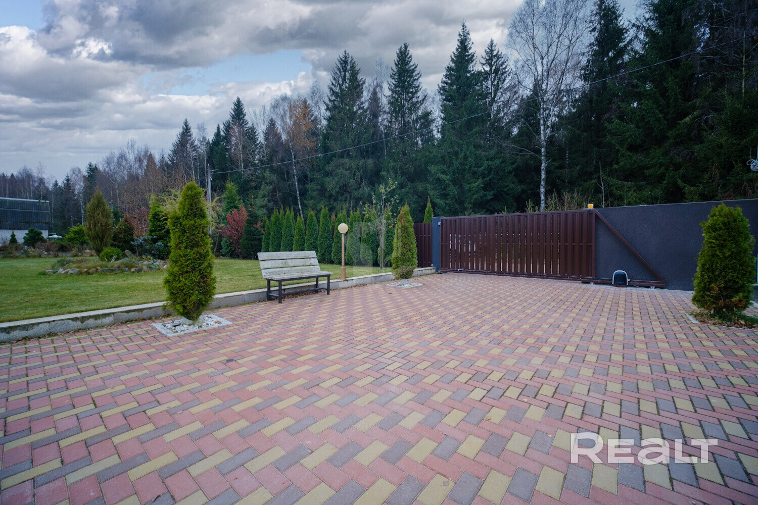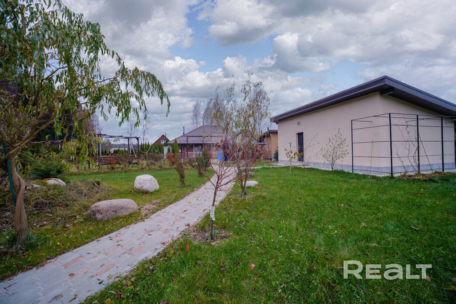 Коттедж стоит на участке в 20 соток. Территория огорожена, есть въездные откатные ворота с электроприводом. Тут также построены баня, кирпичный барбекю-комплекс. Есть помещение для хранения садового инвентаря. Здесь также вымощены дорожки, имеется собственный пруд.