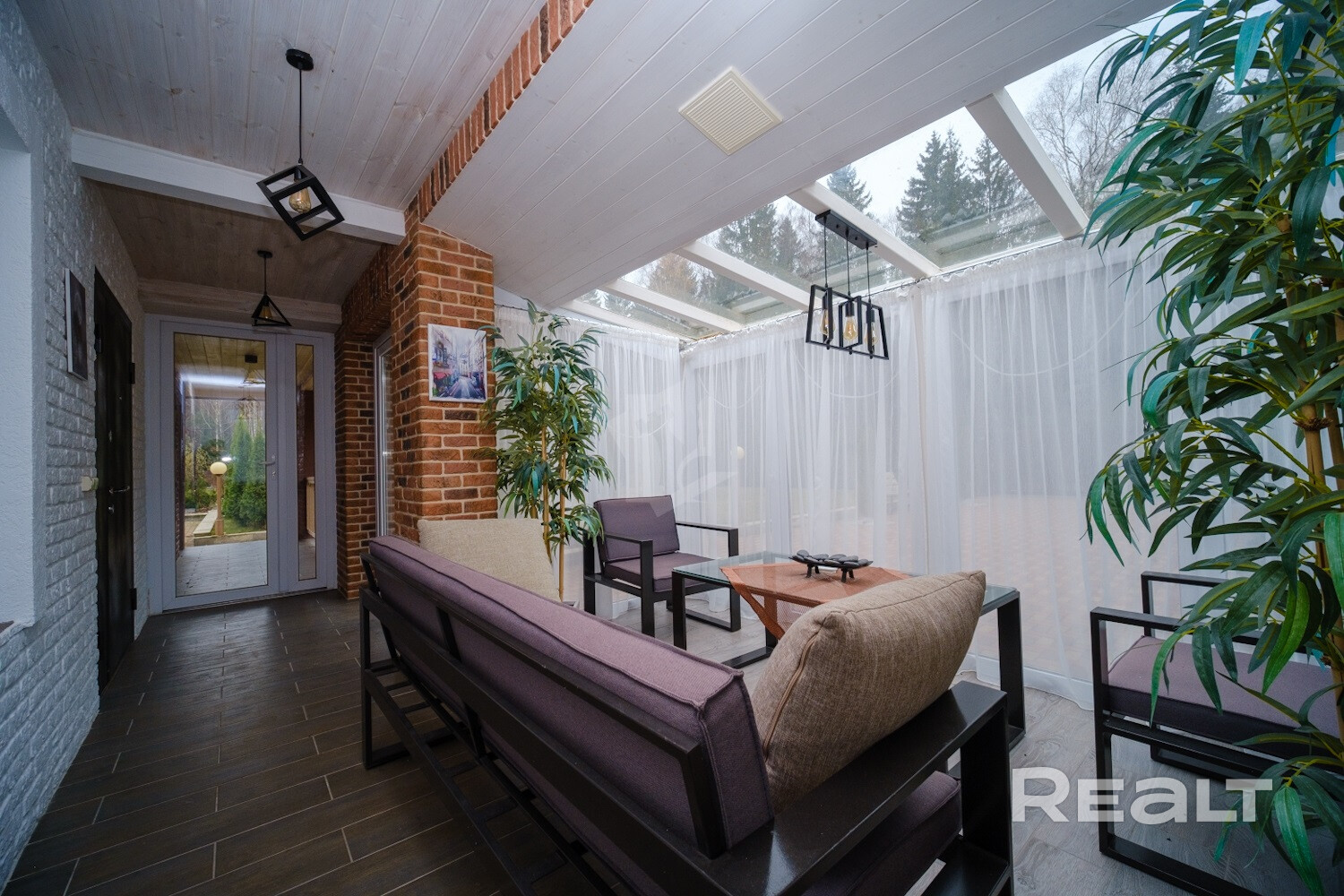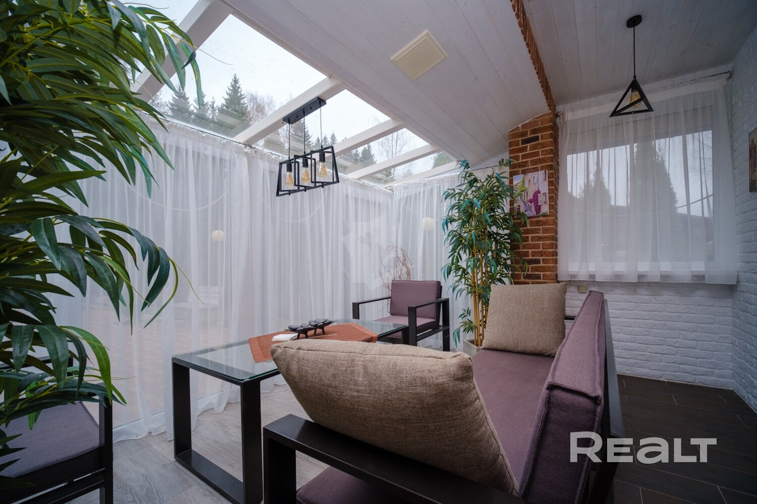 Обустроены комната с печью-камином на дровах и гостиная. Еще одно место для отдыха — застекленная терраса.