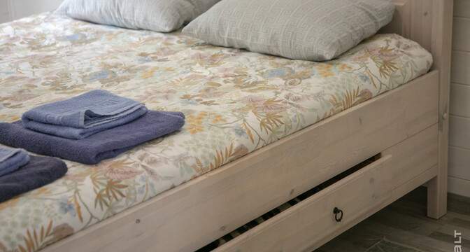 Основной дом на 90 квадратов включает в себя просторную жилую зону и террасу на 15 квадратов. «При проектировании этого дома мы сразу учли все до мелочей. Он задумывался не только как место для жизни, но и для теплых встреч с друзьями. Хотелось, чтобы каждый гость чувствовал себя уютно и комфортно, чтобы у всех было свое пространство. Так, в этом доме две полноценные спальни. В одной из них — двуспальная кровать, в другой — две односпальные, которые при желании можно сдвинуть. Здесь также есть большая кухня и гостиная — общее пространство для общения, отдыха и чаепития с пряниками».