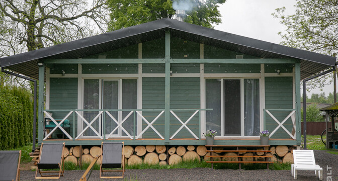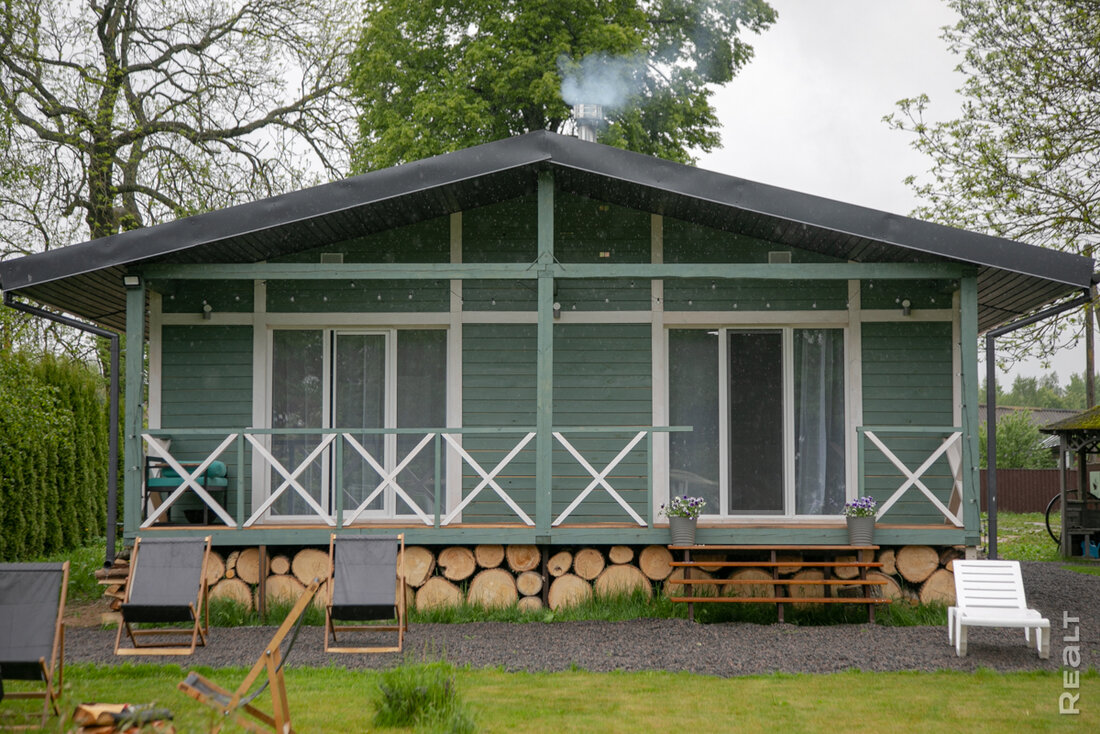 Так, первый построенный на территории усадьбы домик — это студия площадью 36 квадратов с прилегающей террасой в 45 квадратов. Внутри дома спальня с двуспальной кроватью, кухня и гостиная с раскладывающимся диваном, то есть всего четыре спальных места. Домик находится в весьма живописной локации: 50 метров от озера, рядом баня и большая костровая зона, качели, гамак.