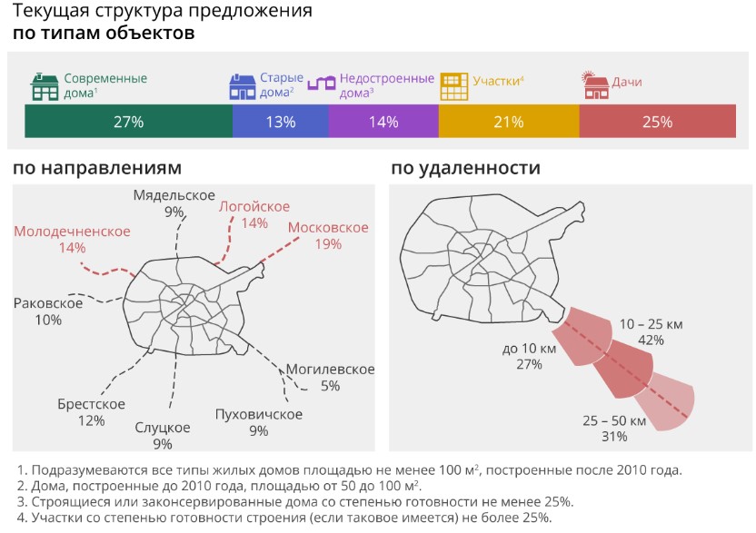 Динамика предложения в зависимости от типа недвижимости была разнонаправленной. Так, число дач в продаже увеличилось на 9%. Выбор участков и старых домов (построенных до 2010 года) вырос на 3% и 2% соответственно. В тоже время предложение недостроенных домов и современных домов, напротив, уменьшилось — на 0.2% и 1% соответственно.
