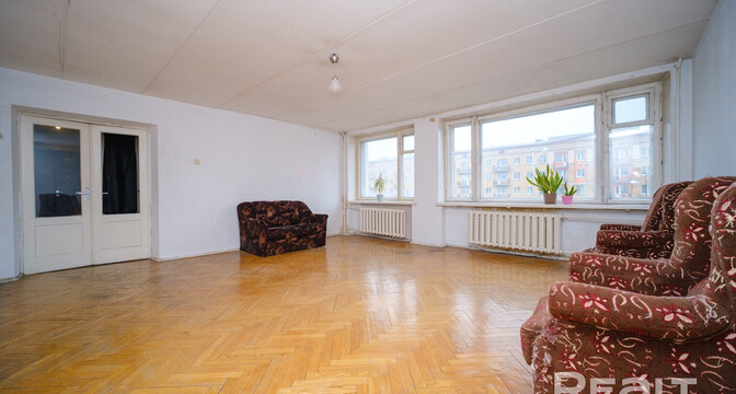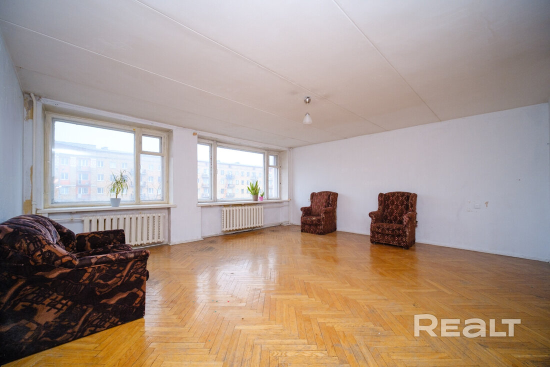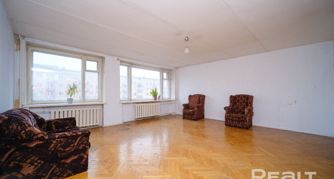 Всего в квартире четыре комнаты. Общая площадь внушительная — 107 квадратов, жилая — 80. Привлекает внимание метраж гостиной — больше 35 квадратов. Здесь два широких окна, а на полу лежит паркет.