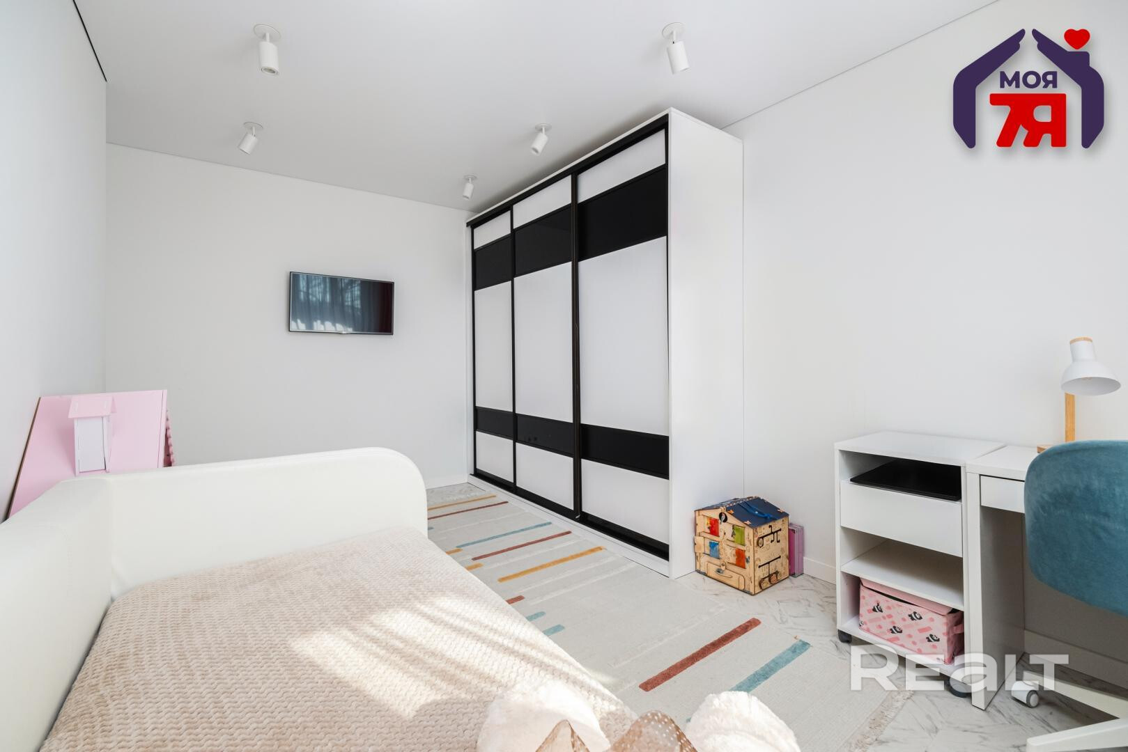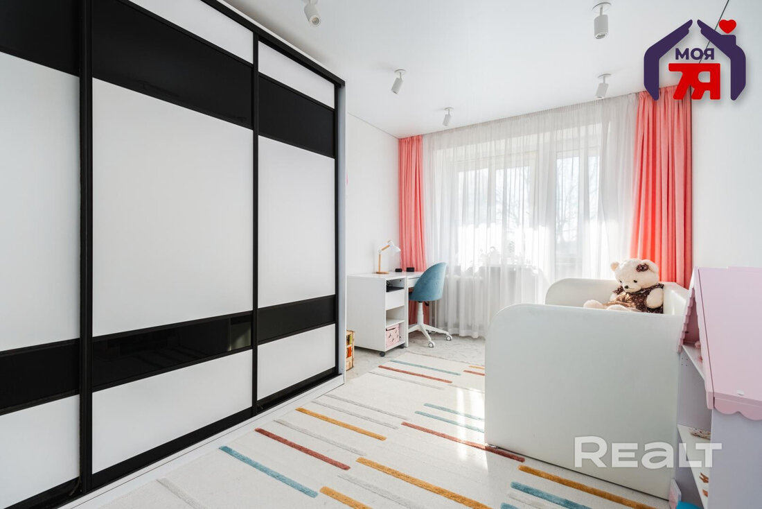 Во второй комнате — детская. Здесь есть большой шкаф-купе, спальное и рабочее место. В детской — выход на застекленную лоджию.