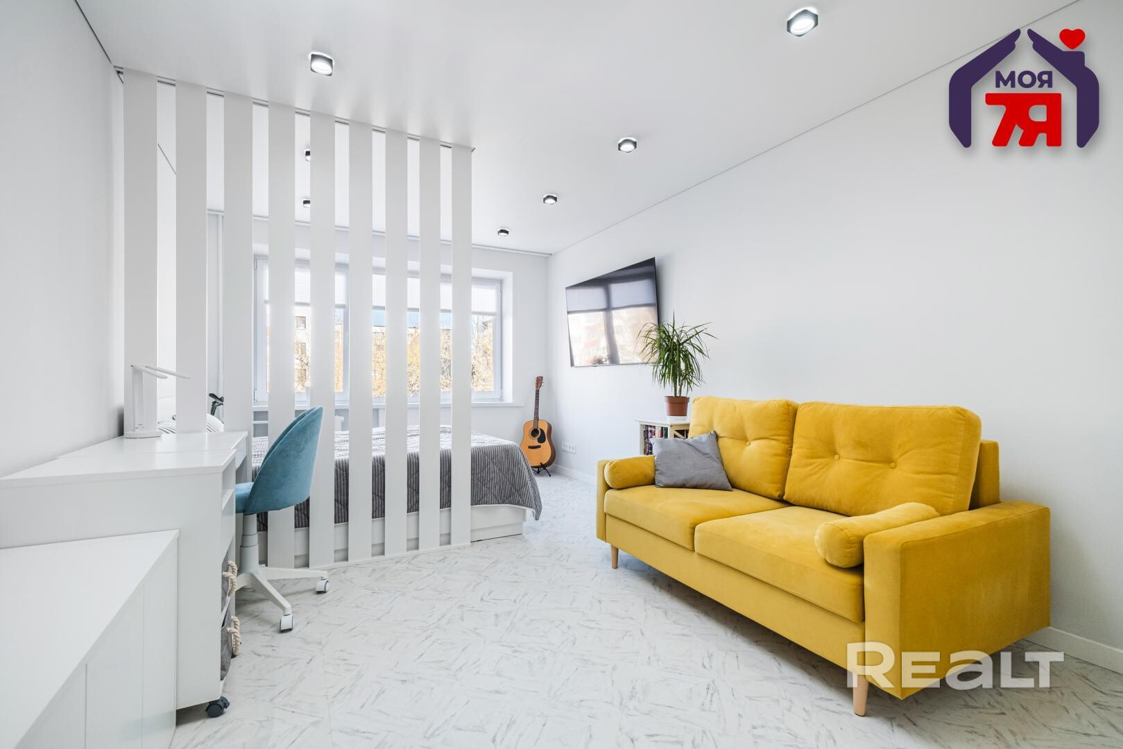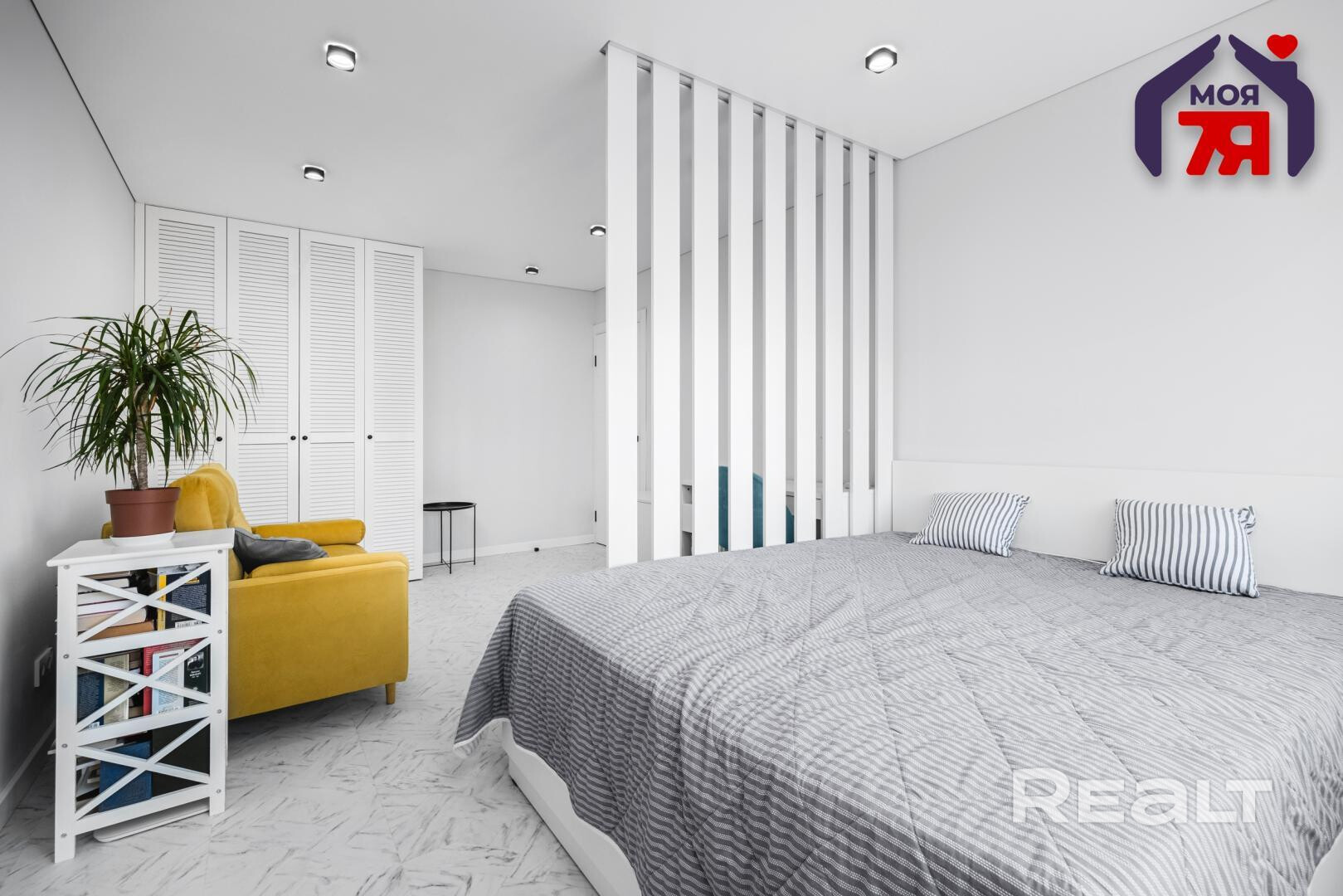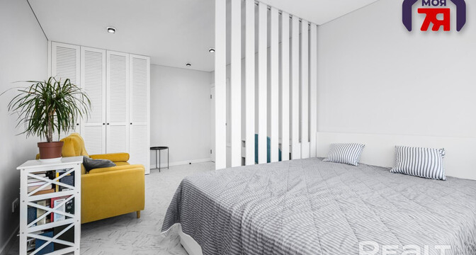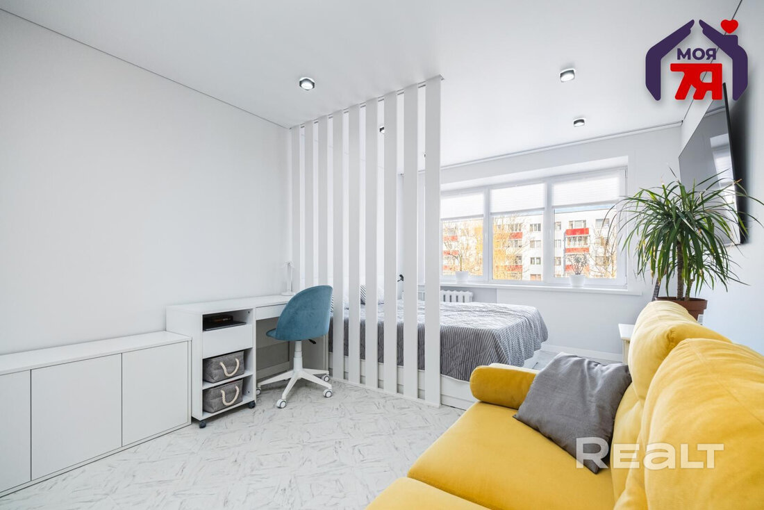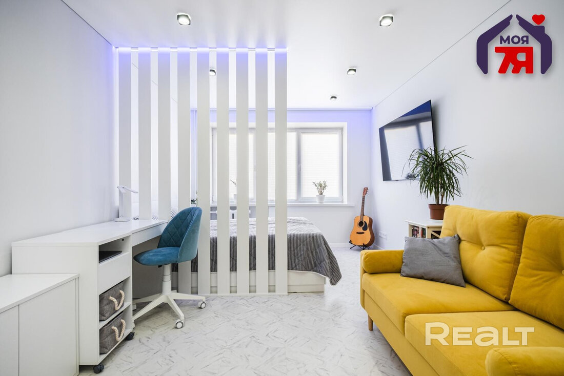 В гостиной вертикальные рейки отделяют спальную зону от зону отдыха и рабочего места. В комнате светлые стены, пол и потолок. Установлен шкаф, есть и другие места для хранения.