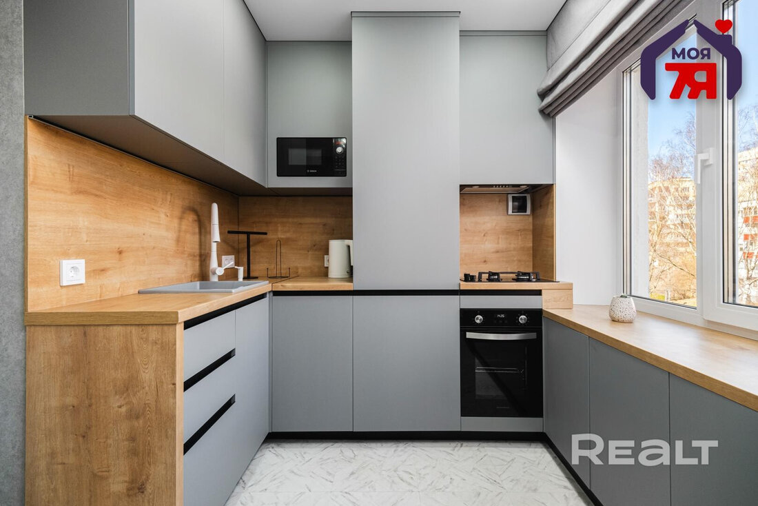 Кухонные фасады выполнены в сером цвете. Есть посудомоечная машина Bosh, встроенный холодильник Samsung и варочная панель Electrolux.