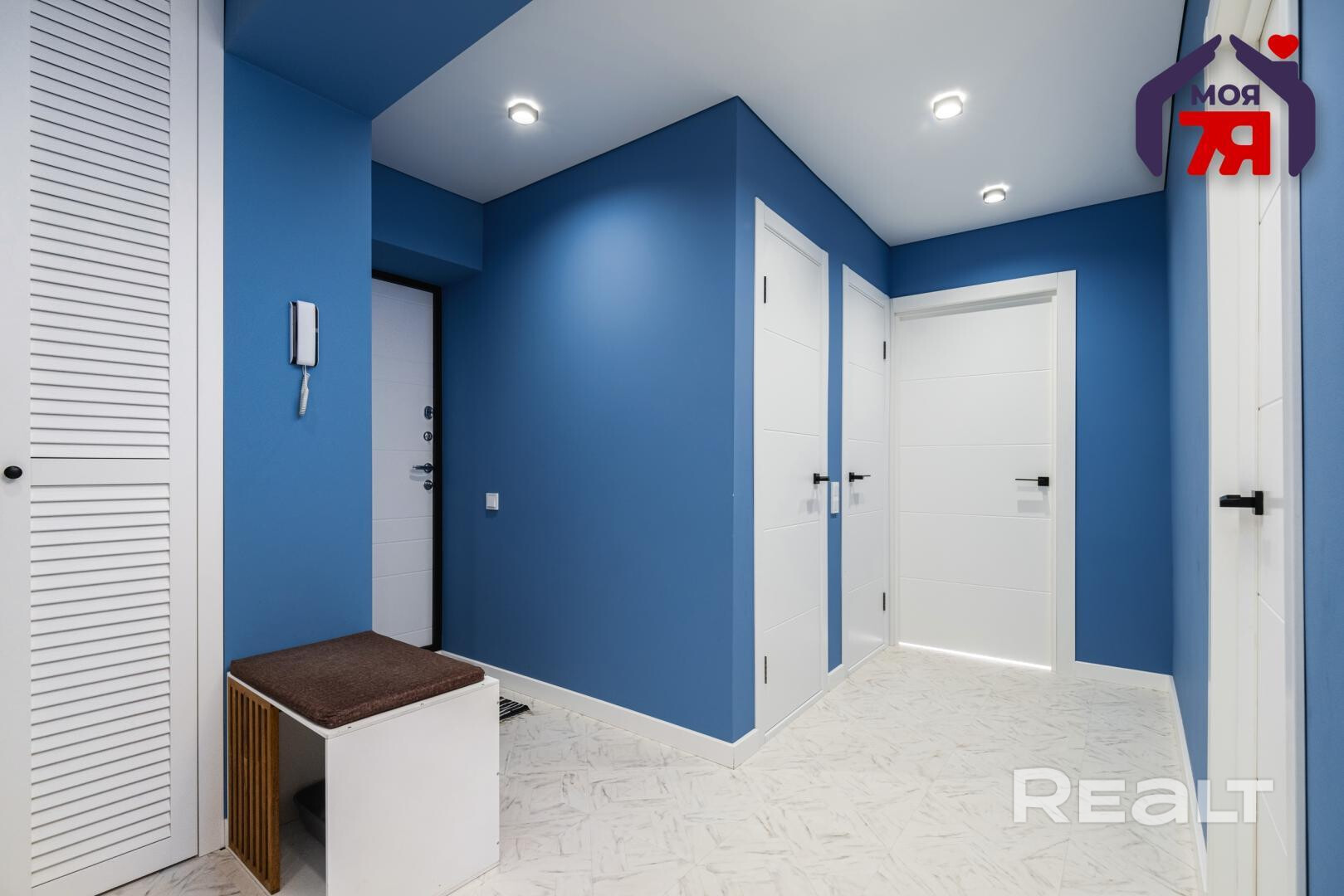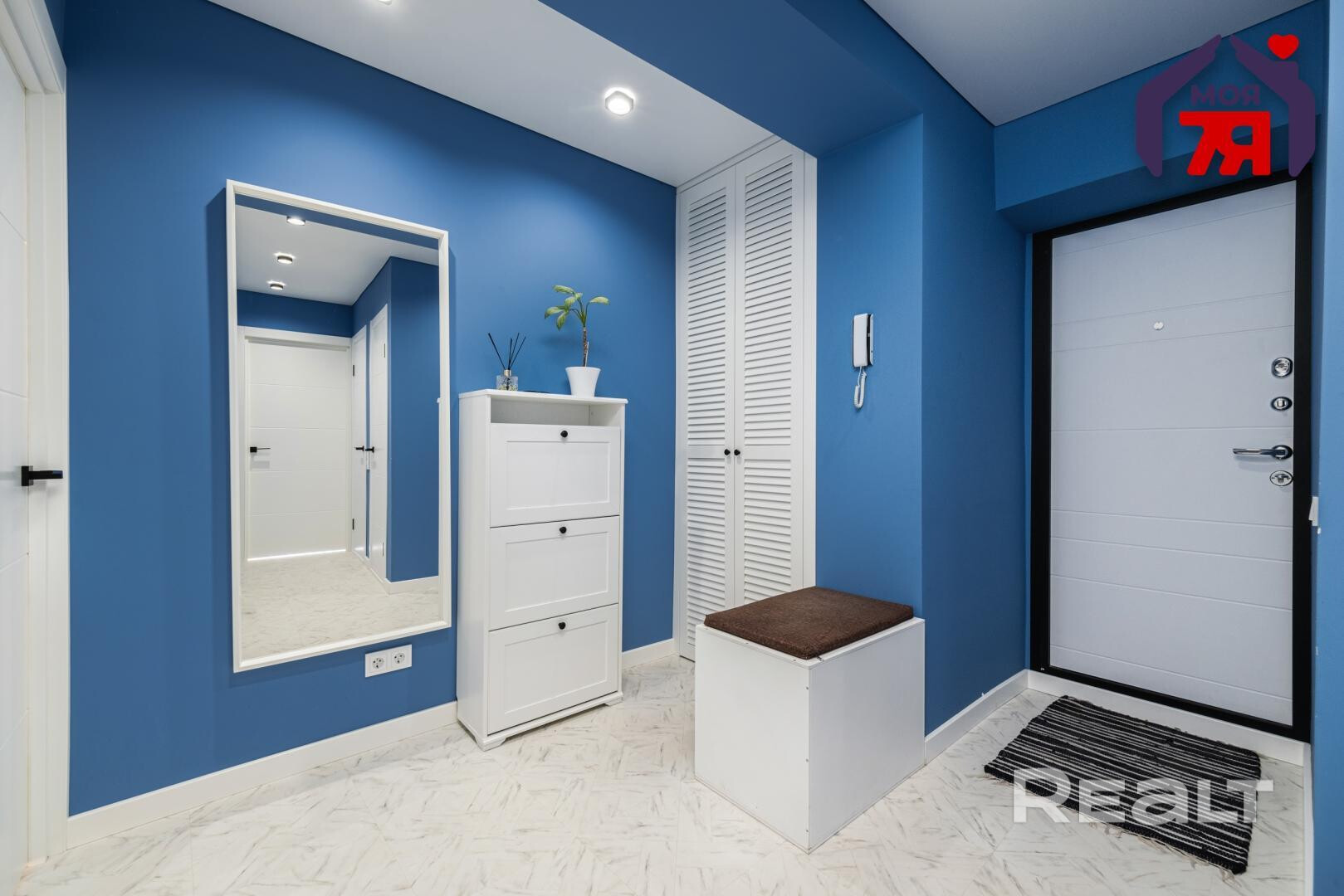 Самая яркая часть квартиры — это прихожая: белые двери и мебель контрастируют со стенами ярко-голубого цвета.
