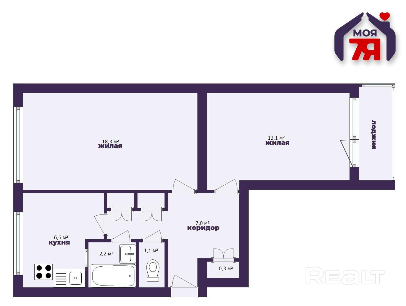 Двушка расположена на четвертом этаже. Ее общая площадь 51 квадрат, а жилой метраж — 31 квадрат (комнаты по 18 и 13 квадратов). Кухня занимает 7 метров. А вот планировка квартиры.