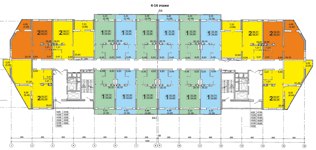 — 12 двухкомнатных квартир общей площадью от 59 до 62 квадратов стоимостью 4700−4900 рублей (1551−1617 долларов).