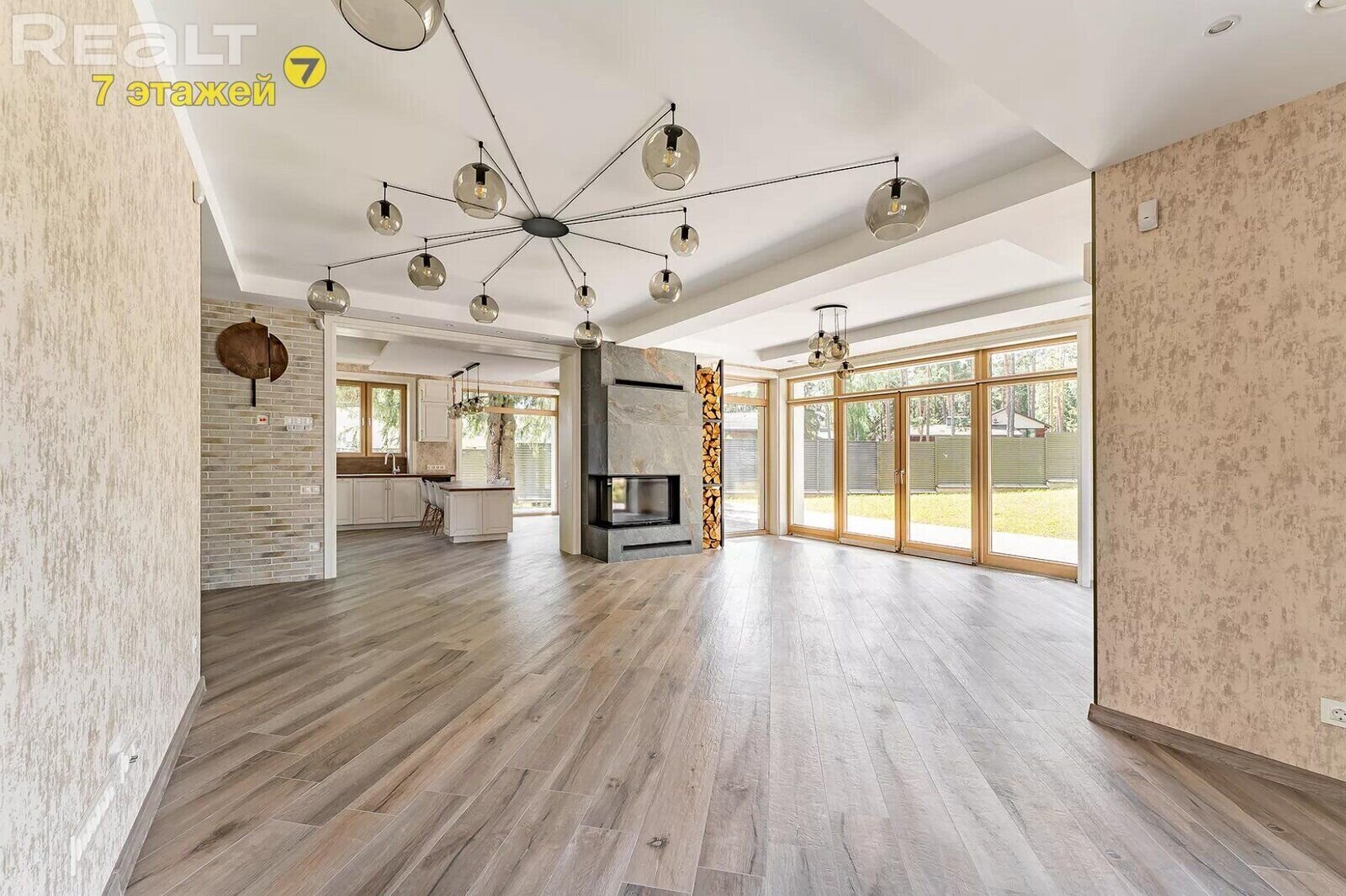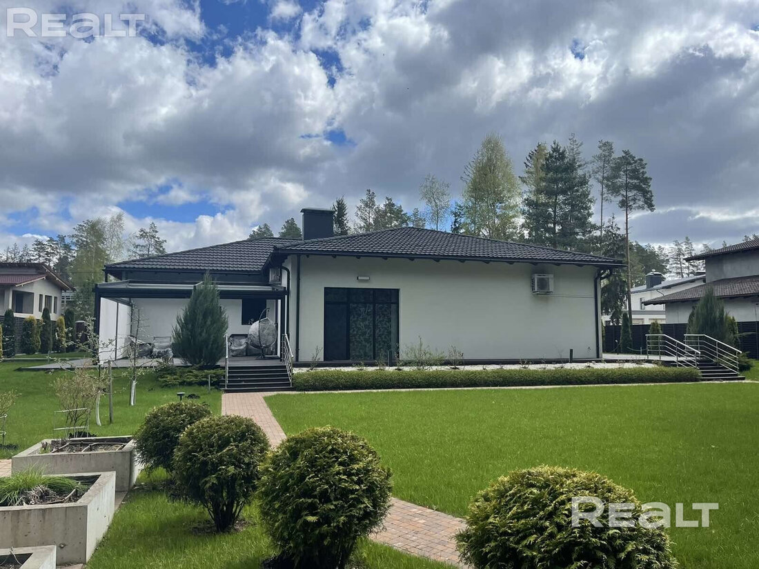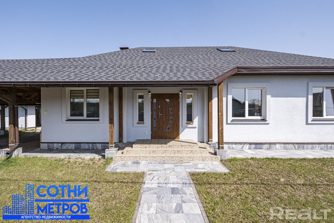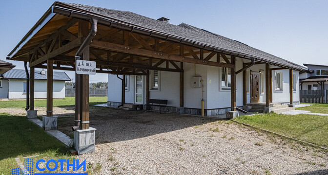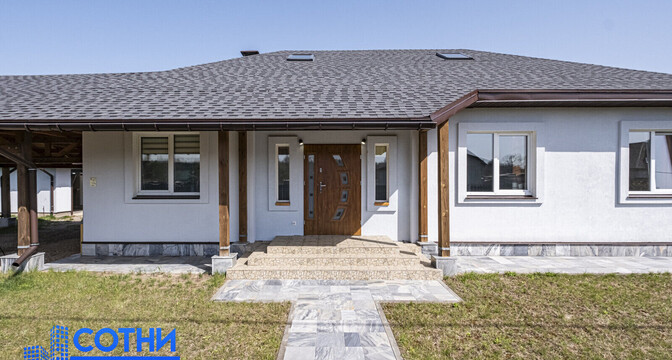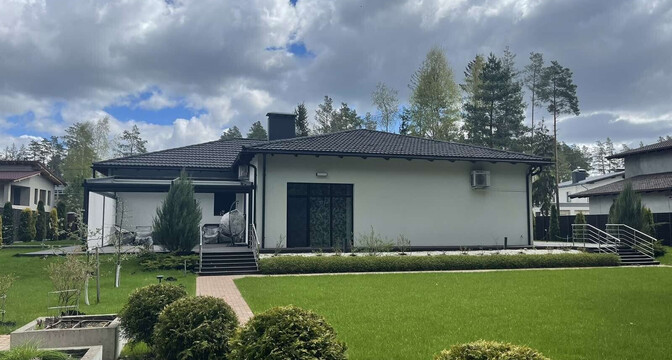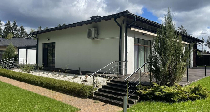 Это одноэтажный дом на 225 квадратов, с дизайнерским ремонтом, ландшафтным дизайном и уютной террасой. Готовый вариант для жизни — все коммуникации подведены, ремонты закончены, мебель расставлена.