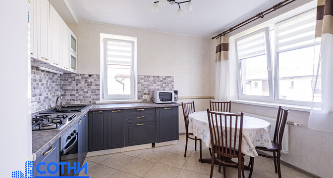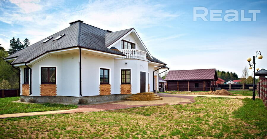 На первом этаже находятся две комнаты, кухня-гостиная, санузел, топочная. На мансардном этаже — еще две спальни. Участок огорожен, с летней кухней и хозпостройками, 16,7 сотки. Стоимость — 157 000 долларов.