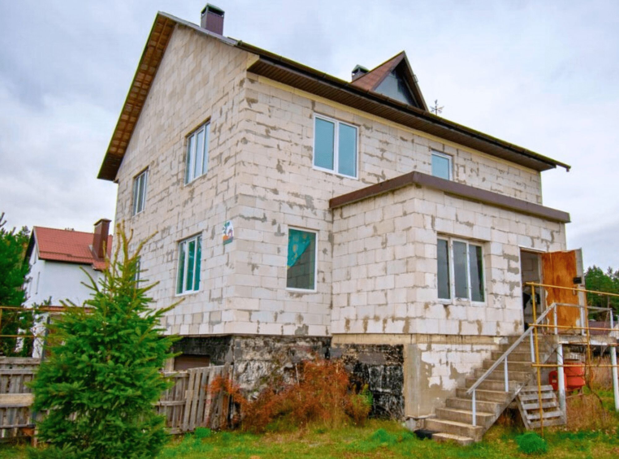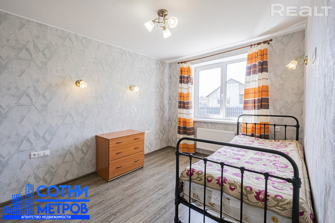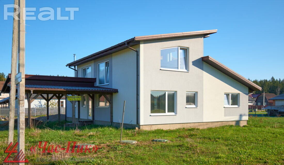 Он из блоков, утеплен, фасад отделан. На крыше — металлочерепица. Внутри 4 спальни, большая гостиная-кухня, два санузла, топочная, кладовка, гардеробная и терраса. Стоимость — 180 000 долларов.
